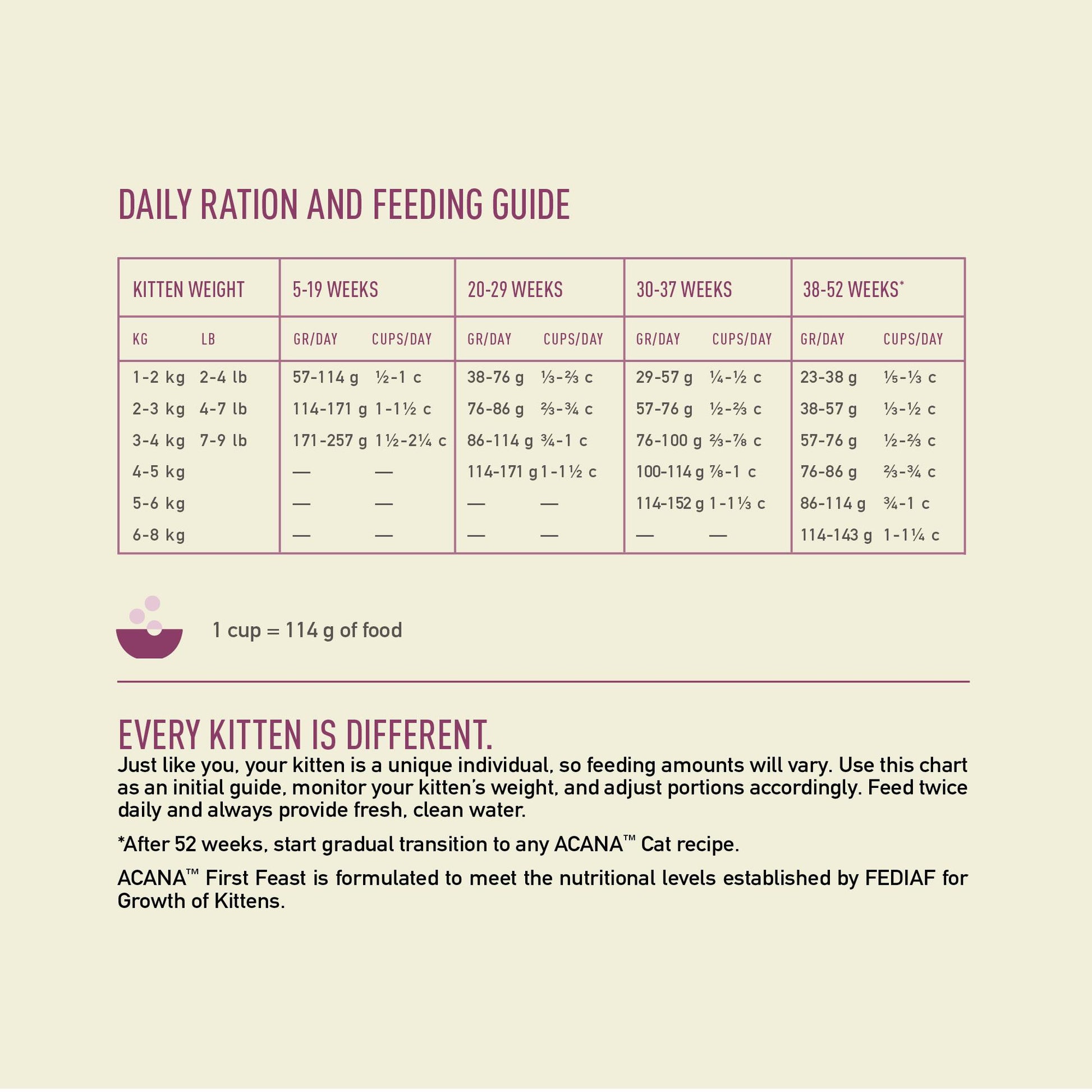 Give your kitten the best start in life with ACANA™ First Feast, a recipe specially crafted to support healthy growth and development. Packed with 70% quality animal ingredients, including fresh or raw free-run chicken and whole herring, this protein-rich formula helps build strong muscles and bones. With nutrients that support brain and eye development, a healthy skin and coat, and overall vitality, First Feast provides everything your kitten needs to thrive in their early months—and beyond.