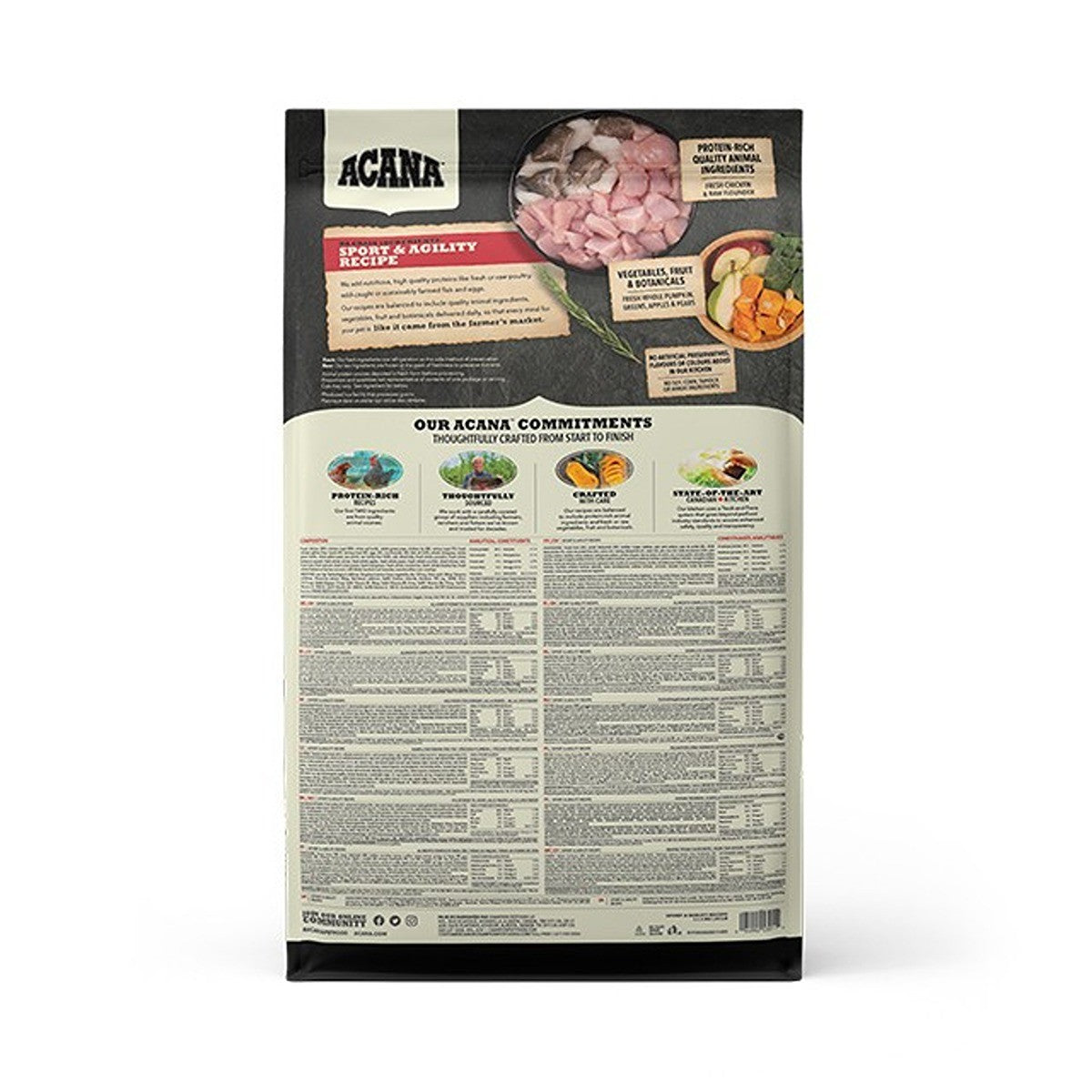 ACANA™ Sport & Agility is packed with protein and fat from animal sources, supporting sustained activity and endurance to keep up with the high energy needs of active dogs. Made with 75% quality animal ingredients like fresh free-run chicken and raw hake, to support stamina, strength and peak performance. It’s balanced with 25% fresh vegetables, fruit and botanicals, like whole pumpkin, greens, apples and pears, to provide the premium nutrition your active dog needs to live their best life.