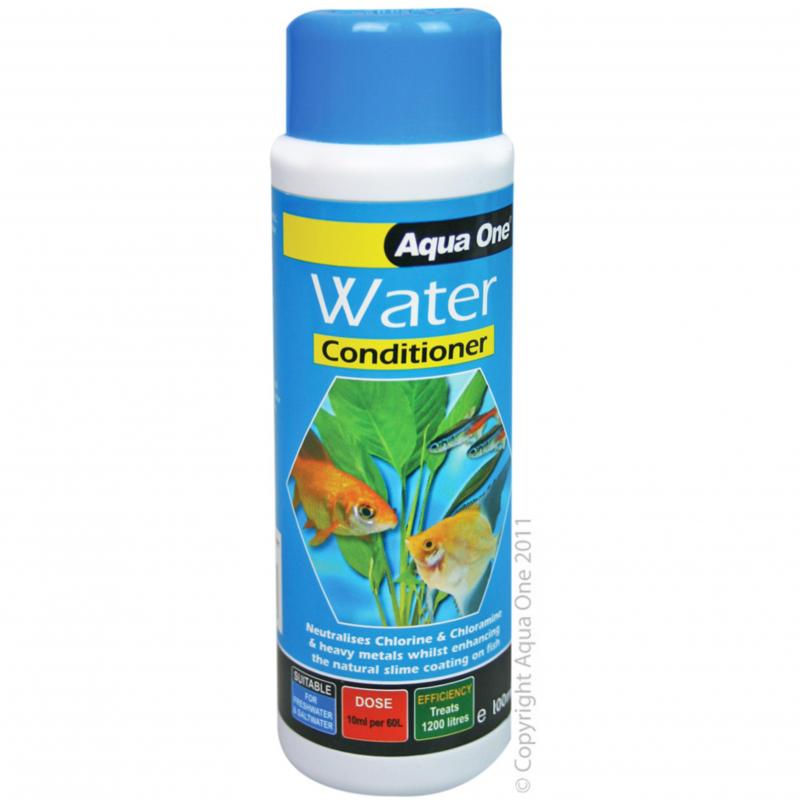 Aqua One Water Conditioner improves aquarium water by removing harmful toxins such as chlorine & chloramines found in tap water whilst enhancing the natural protective slime coating on fish.
