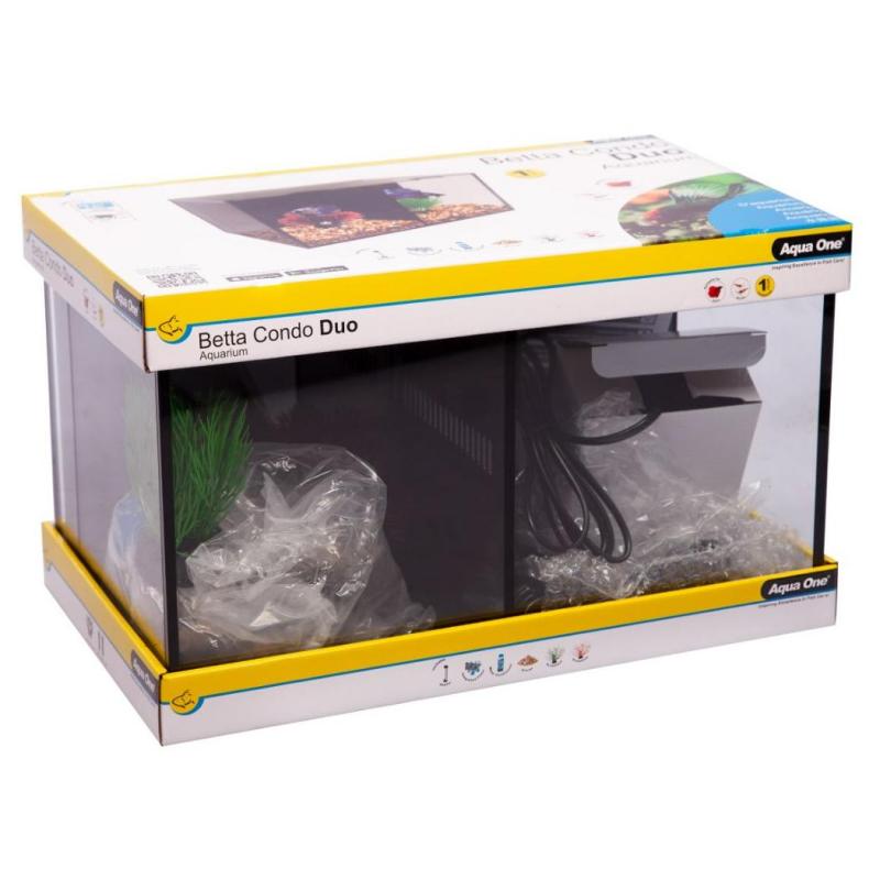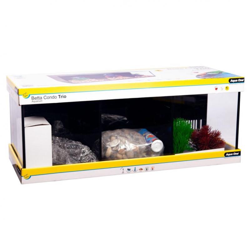 The Aqua One Betta Condo is a compact and stylish aquarium kit specially designed for Betta fish. The kit includes everything you need to keep your Betta happy and healthy. The Betta Condo is available in duo and trio, perfect for housing 1, 2 or 3 Betta fish together safely!