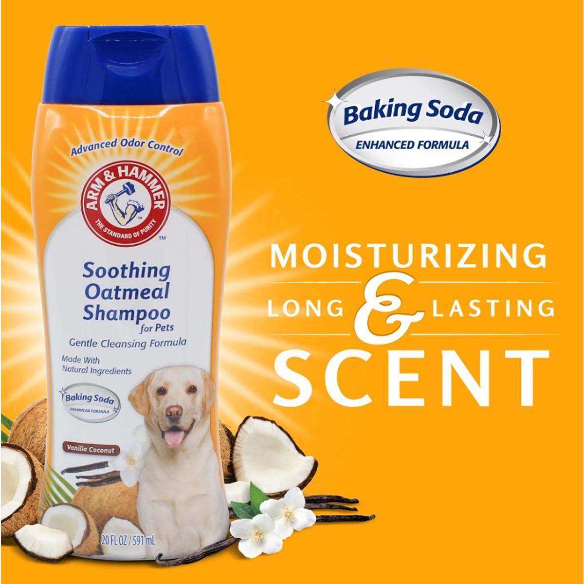 Arm & Hammer Soothing Oatmeal Shampoo combines the trusted power of baking soda with soothing oatmeal to provide a refreshing and odor-eliminating bath experience for your dog. Infused with the delightful scent of vanilla coconut, this shampoo is designed to gently cleanse and soothe your pet's skin while being safe to use alongside topical flea and tick treatments.