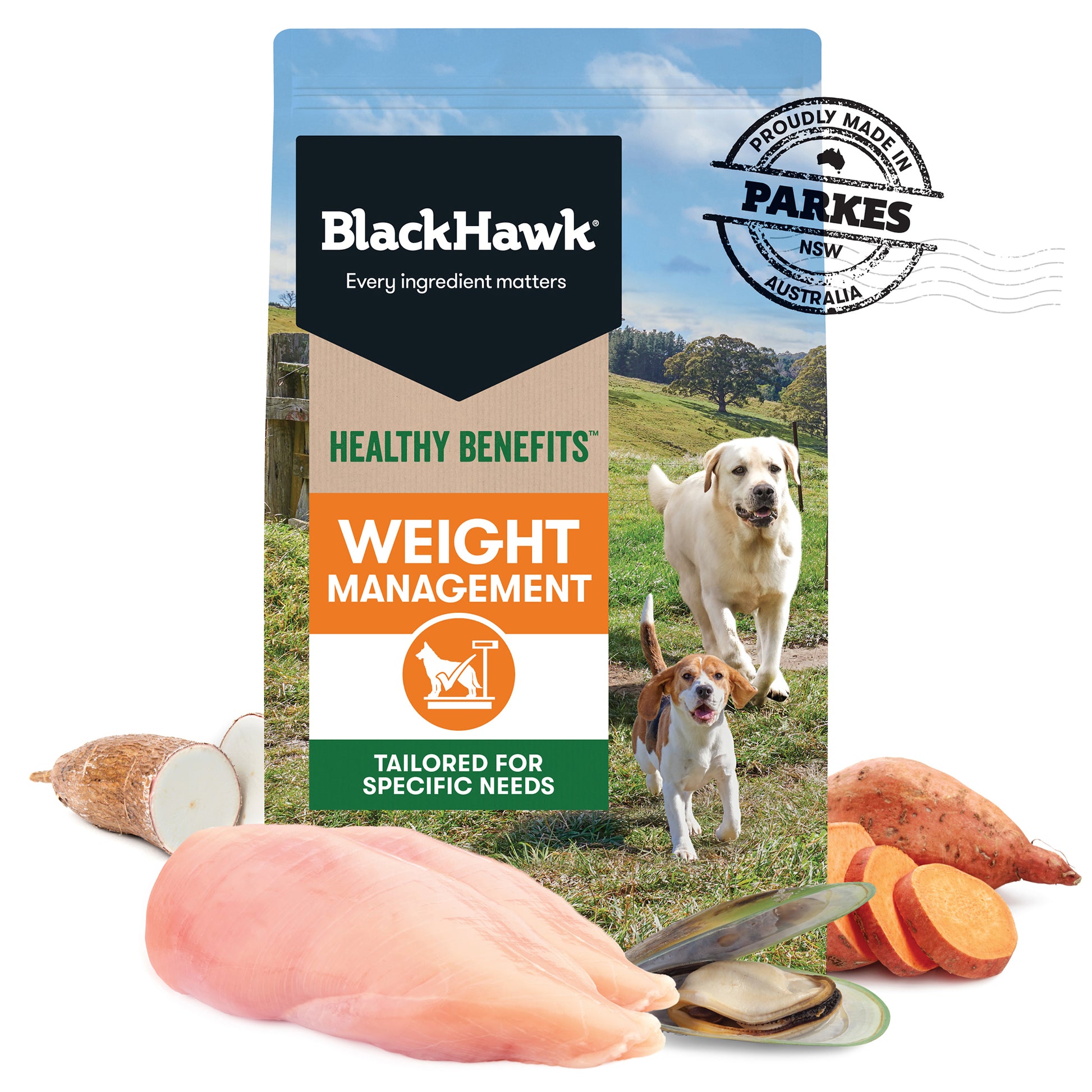 Black Hawk Healthy Benefits Weight Management has been developed as a lower calorie diet* to help adult dogs maintain a healthy weight. It contains supplementary L-carnitine to help boost fat metabolism and maintain strong muscles. The kibble is a unique shape that aims to slow their eating, with ingredients to help them feel fuller for longer. *9% lower calories than Black Hawk Original Adult Chicken & Rice.