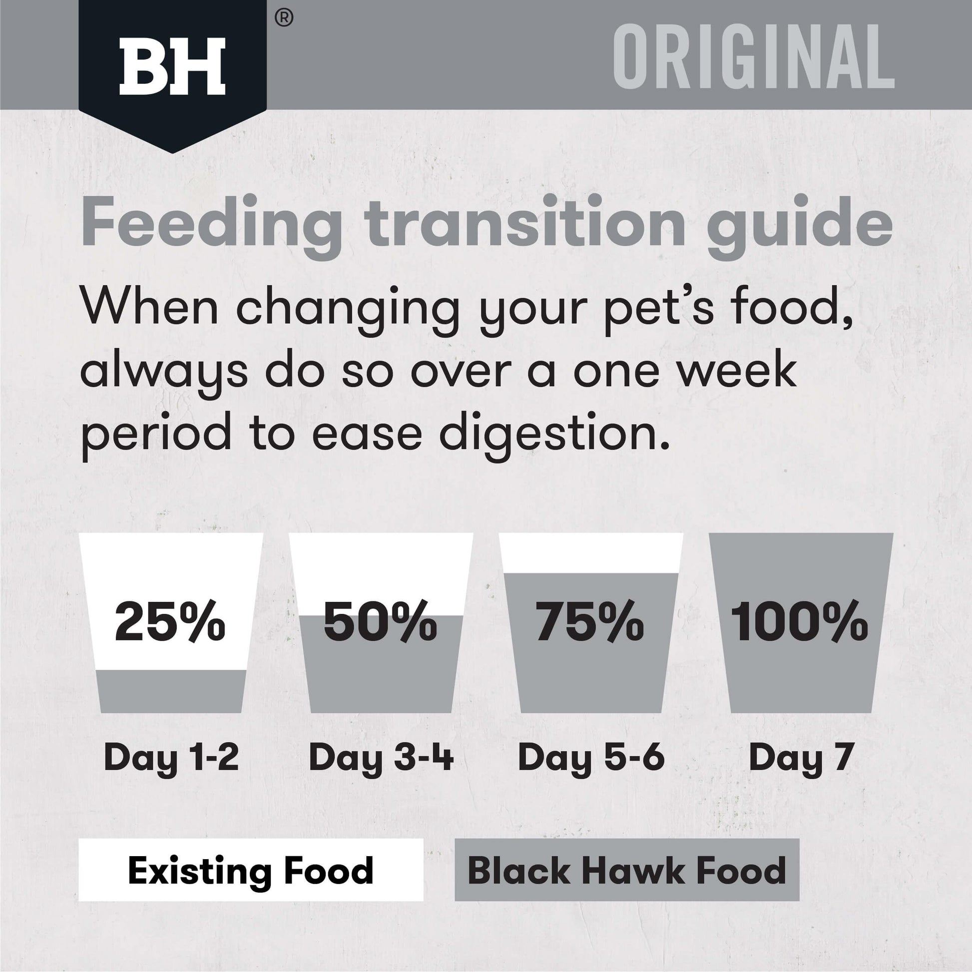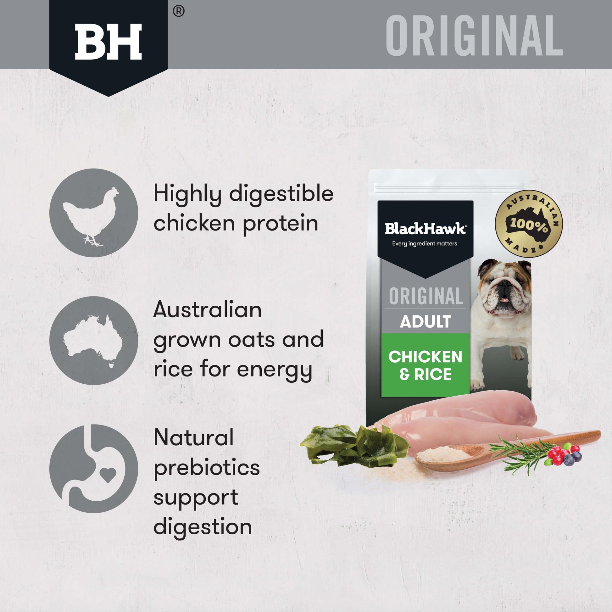 Black Hawk Original Adult Chicken Rice Dog Food is a chicken formula with lower energy and fat levels, yet full of flavour. Black Hawk only use the highest quality Australian sourced meats, grains, fresh vegetables and fruit. Oats and rice are an excellent source of carbohydrate, providing a slow-release energy source that is essential to the body and digestive health. Nothing but the best for your best friend.