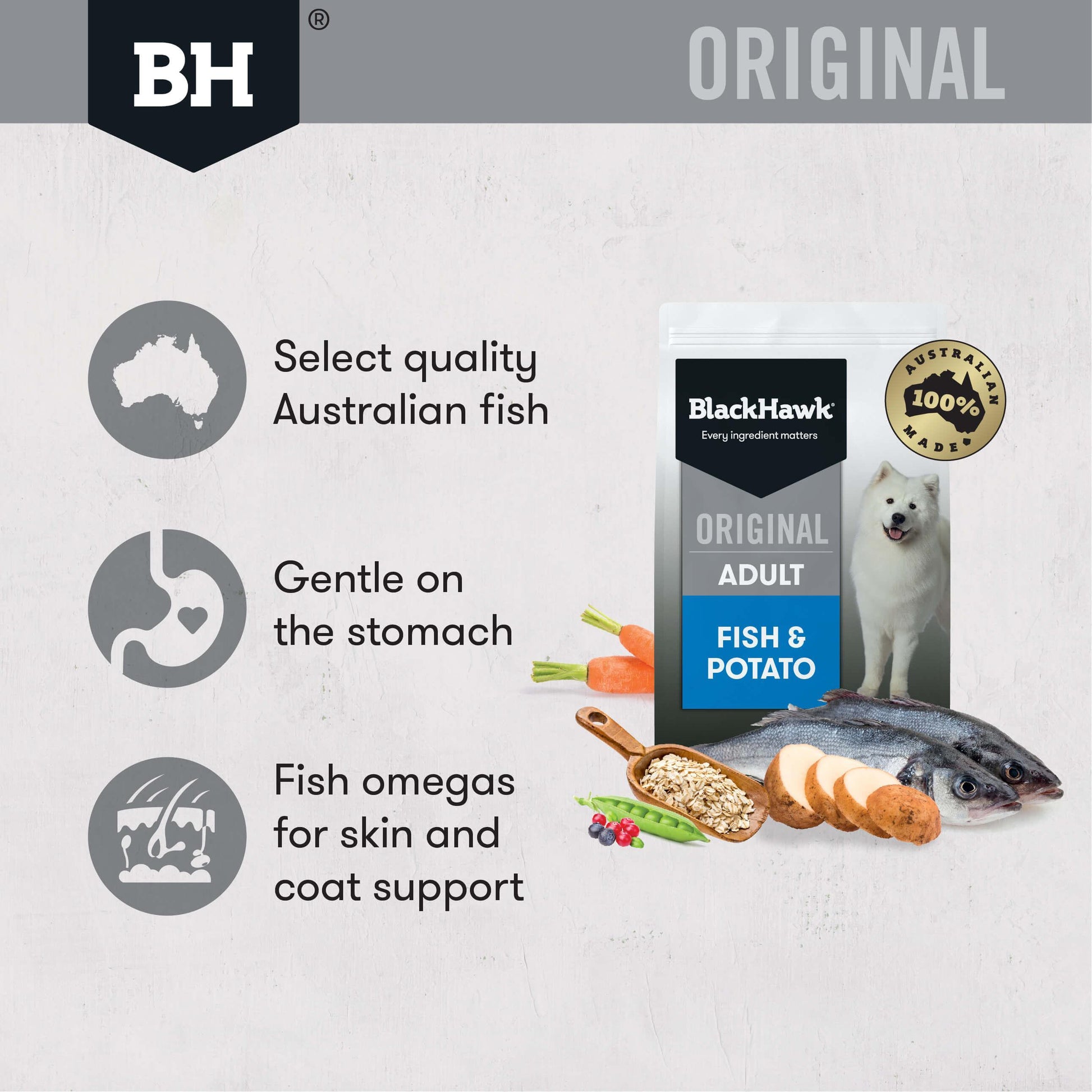 Ocean fish and salmon provide a novel protein for dogs with allergies or intolerances to the proteins commonly found in dog foods. Potato, oats and rice are good sources of energy, rich in vitamins and minerals, and are an easily digested carbohydrate source ideal for dogs with sensitive stomachs. Black Hawk use the highest quality Australian sourced meats, grains, fresh vegetables and fruit. Nothing but the best for your best friend.