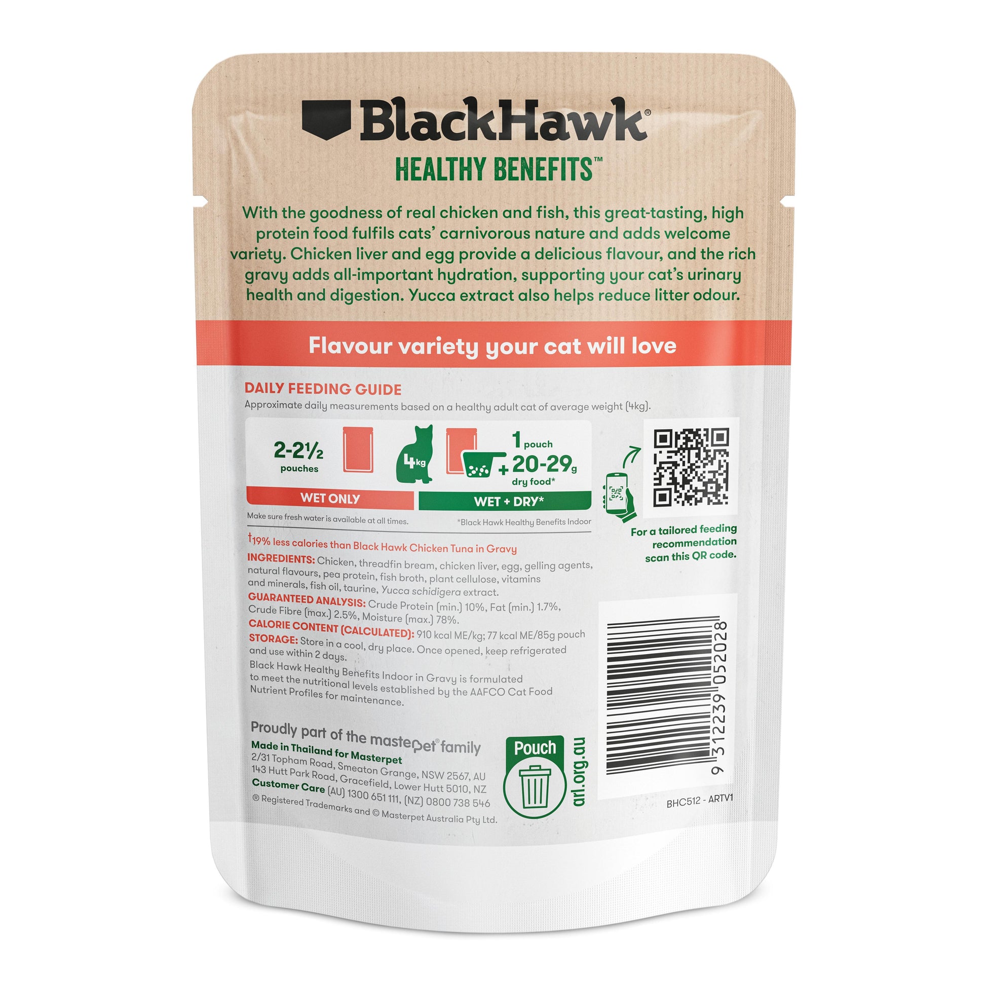 Formulated for indoor cats with the goodness of real chicken and fish, this great-tasting, reduced calorie diet*, fulfils cats’ carnivorous nature and adds welcome variety. Chicken liver and egg provide a delicious flavour, and the rich gravy adds all-important hydration, supporting your cat's urinary health and digestion. Yucca extract also helps reduce litter odour.*19% less calories than Black Hawk Chicken Tuna in Gravy