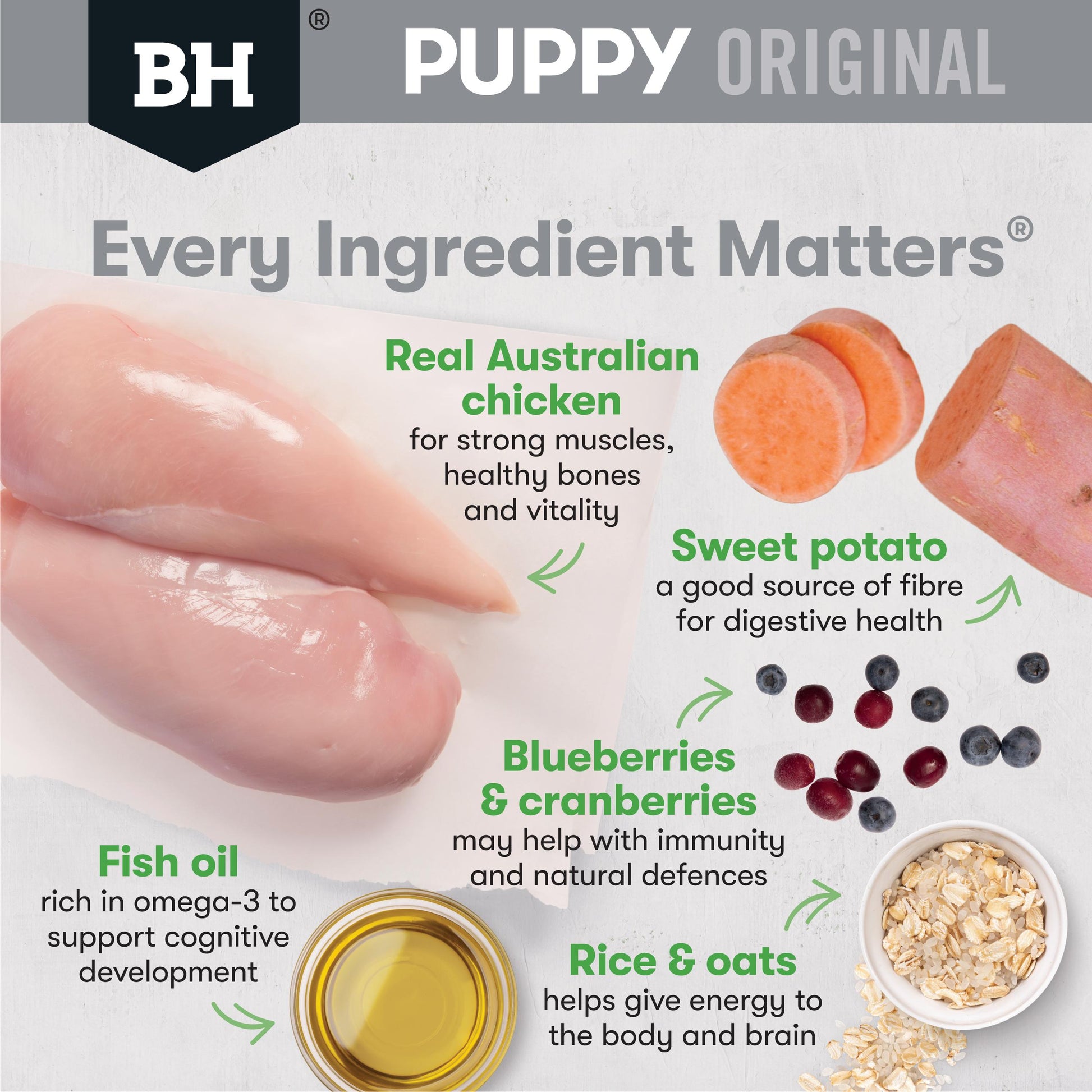 Black Hawk Original Chicken & Rice for Small Breed Puppies has been formulated by pet nutritionists and vets to help your puppy thrive and reach their potential for growth, development, and learning. Made with Australian chicken, a highly digestible lean protein source packed with essential amino acids for strong muscles, healthy bones, and vitality. This balanced high-quality diet also includes sweet potato which is a rich source of fibre for intestinal health and omega-3 fatty acids from fish oil for brain development. A blend of Australian sourced rice and oats help provide energy to the developing body and brain.