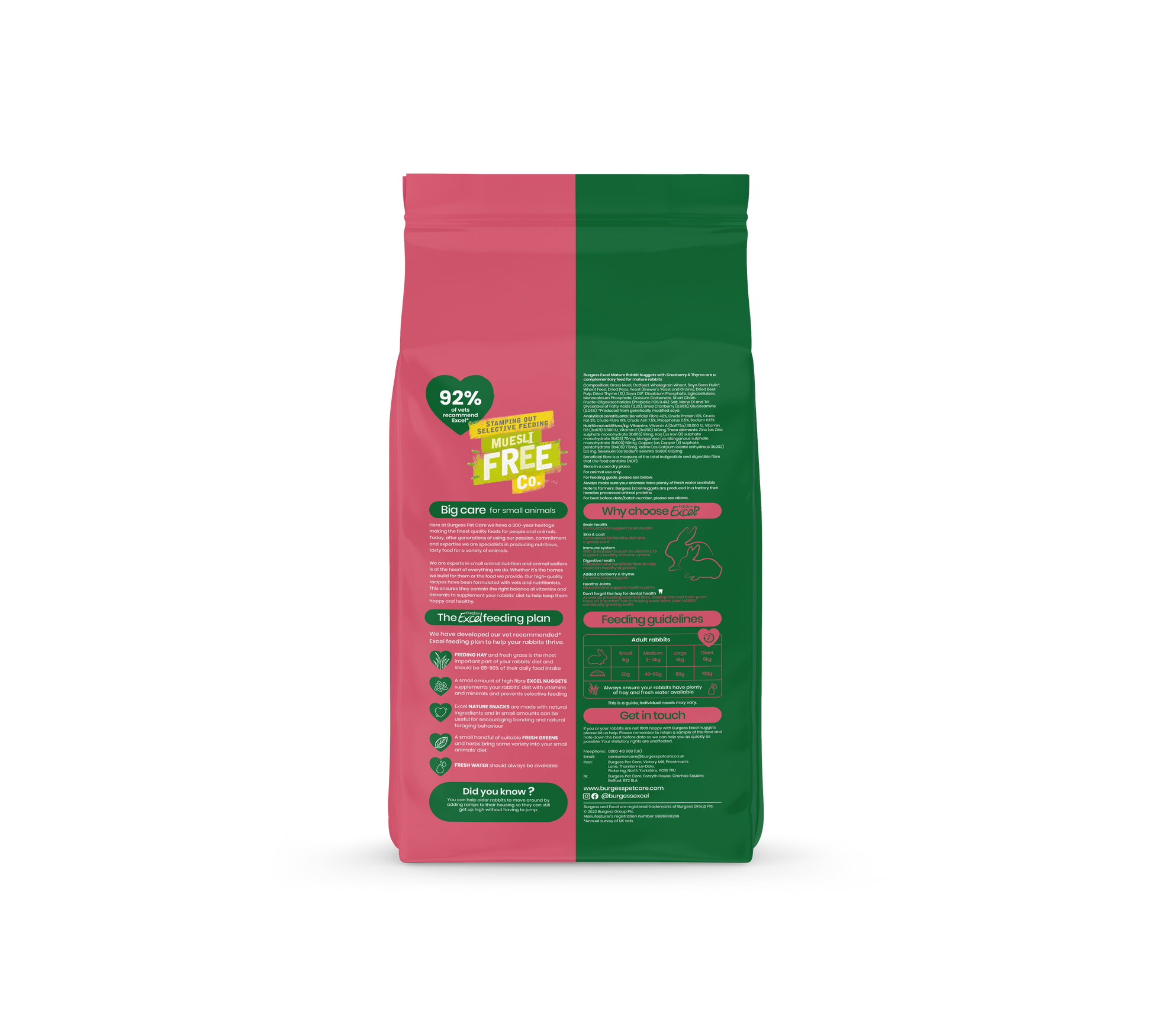 Our delicious, high fibre Mature Rabbit Nuggets with Cranberry & Thyme supplement your rabbits’ diet with vitamins and minerals and prevent selective feeding. Suitable for older rabbits aged 5 years+.