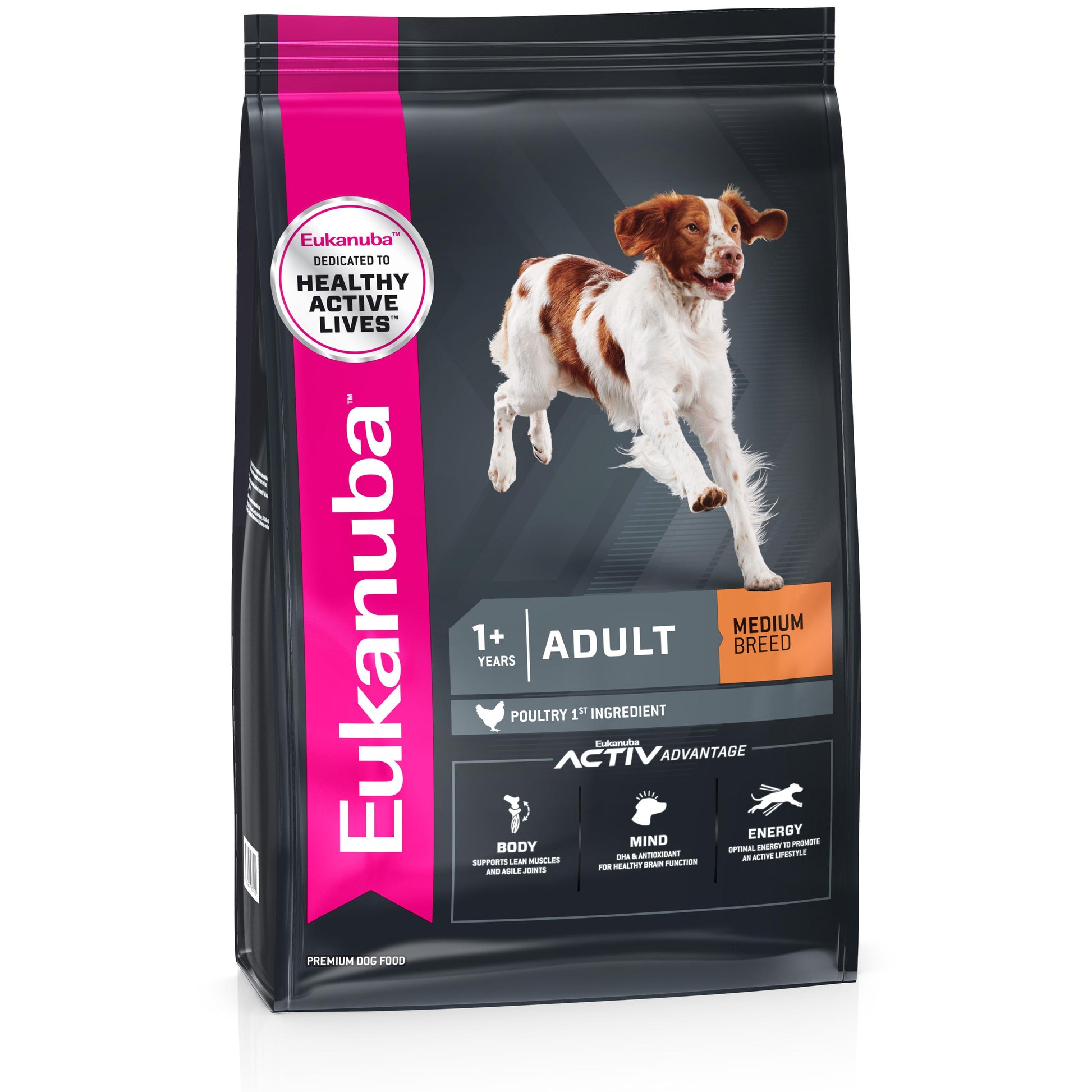 Eukanuba Medium Breed Adult Dry Dog Food provides optimal nutrition for adult medium-sized dogs (11-24 kg) The kibbles are medium size and contain high-quality ingredients such as poultry protein as our No 1 ingredient, fat, carbohydrates, fibres and important vitamins and minerals for the health and well-being of your adult all breed dog.