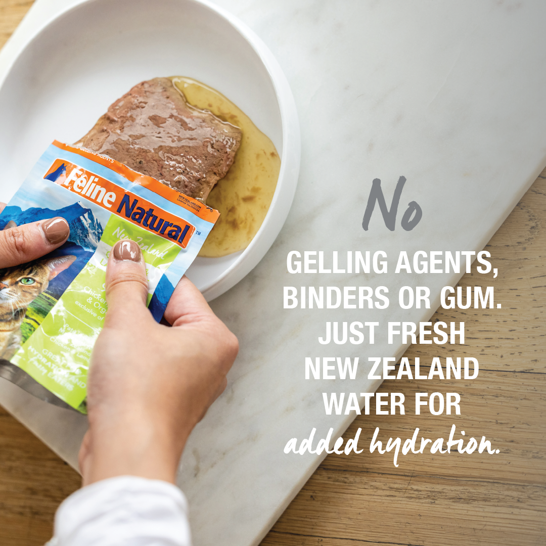 Packed full of New Zealand wholefood ingredients, our Feline Natural Pouches are made from 98%+ grass-fed free-range meats, cage-free chicken or sustainably caught fish and provide the rich and nourishing proteins and fats needed to give your cat a natural source of energy to thrive. Inspired by nature, guided by science. For your ultimate peace of mind, Feline Natural diets are Complete and Balanced to meet all AAFCO requirements. Our recipes are made without GMO ingredients, fillers, legumes, plant protein, starch, preservatives gum or binders and come in a convenient, mess-free, single serve pouch.