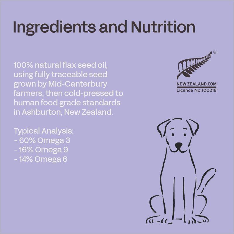 Our flax seed oil naturally contains over 60% Omega 3, much higher than any other fish or plant oils. Flax seed oil is a great source of Omega 3, 6 & 9 Essential Fatty Acids, which dogs can’t make themselves so must be obtained through the diet or supplements. This oil brings fantastic benefits for your dog’s skin, coat, joints and heart health. Support the overall wellbeing and happiness of your furry friend!