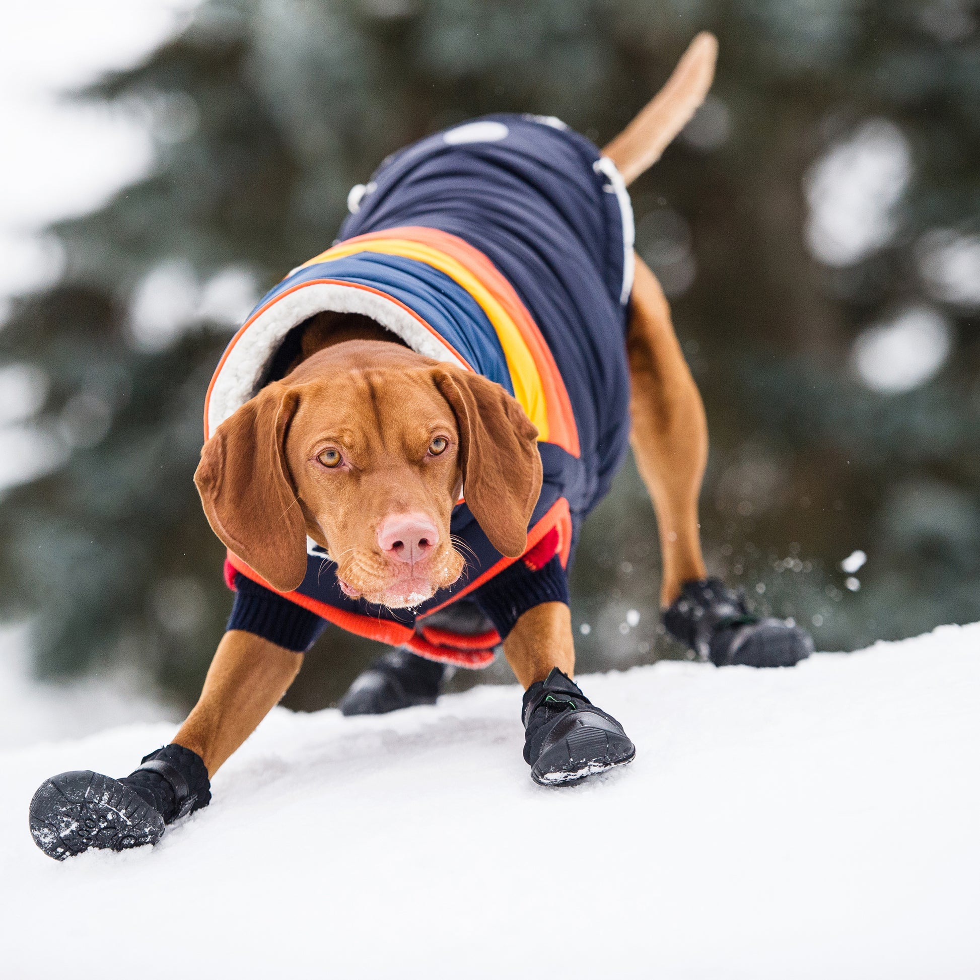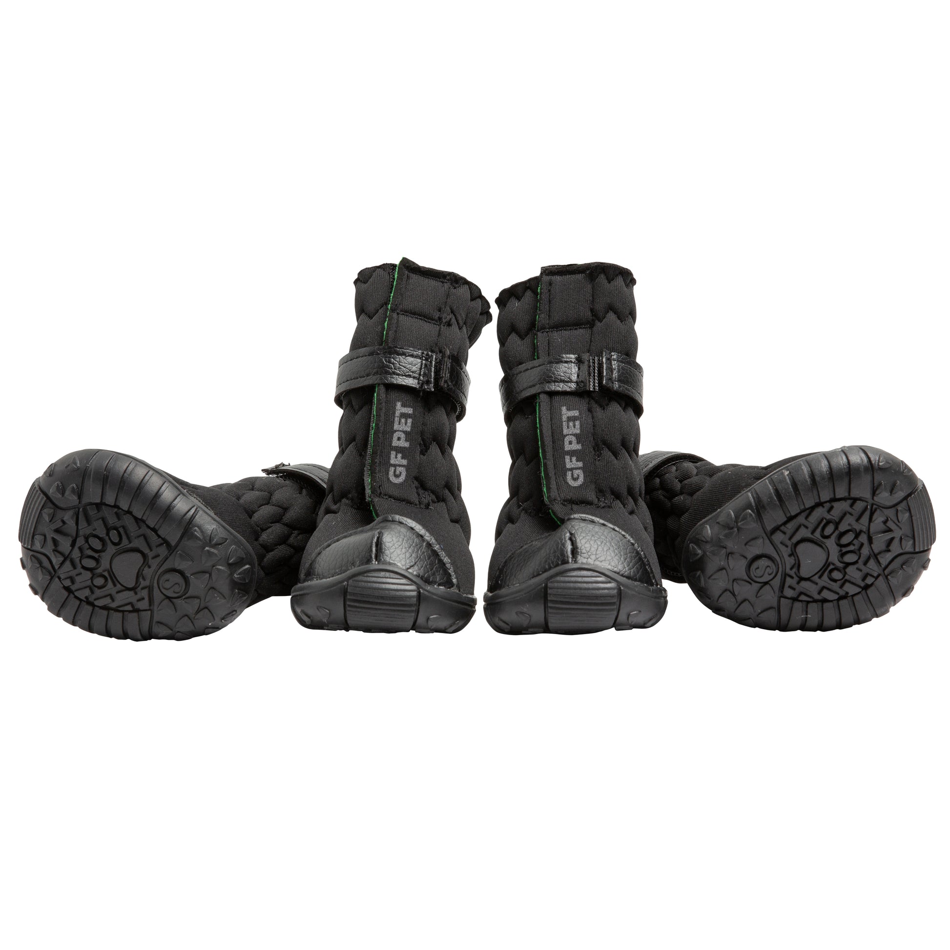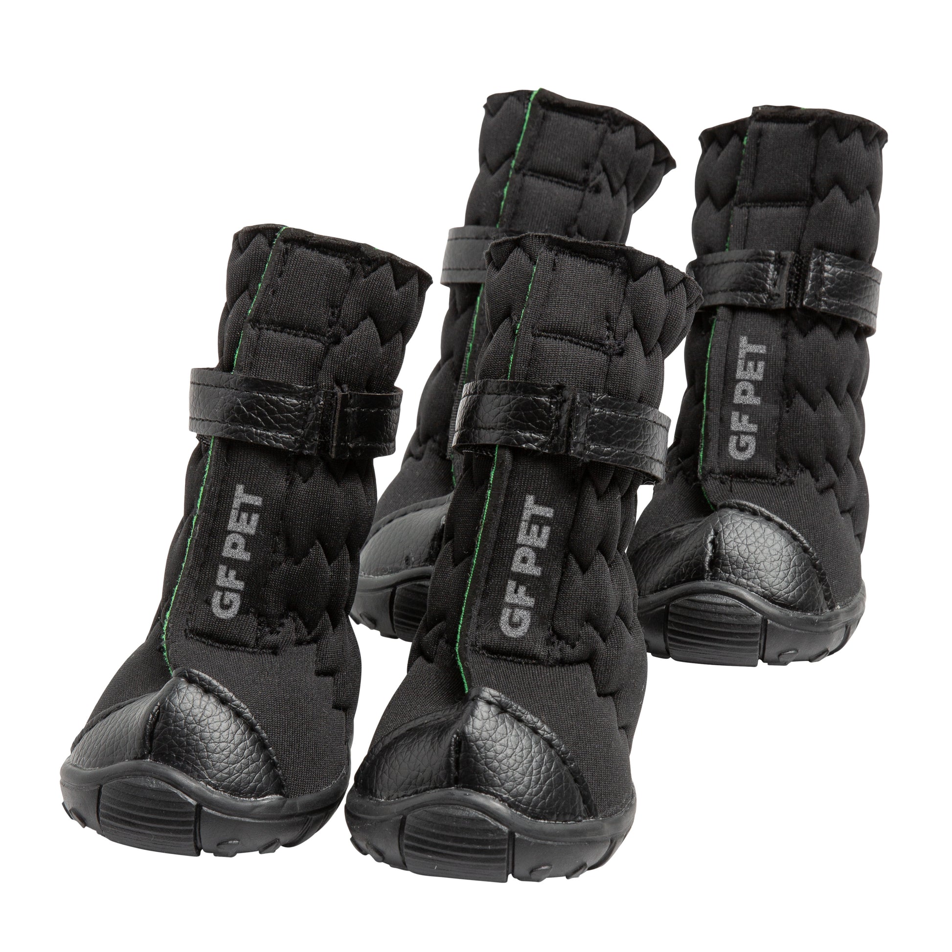 The GF PET® Elasto-Fit® Boots stretch to hug your dog’s unique paw shape. With this easy slip-on shape, just slip your dog’s paw into the base of the boot and let the elastics all around hug your dog’s leg. Secure them with the vertical hook & loop closure and strap to keep them snugly in place! The traction control soft sole helps grip onto ice, snow, rain and pavement and protects the paw from cold, slipping and salt burn. Made of water-resistant neoprene, you can customize the height to fit taller or shorter legs. Revolutionary and Patent-Pending!