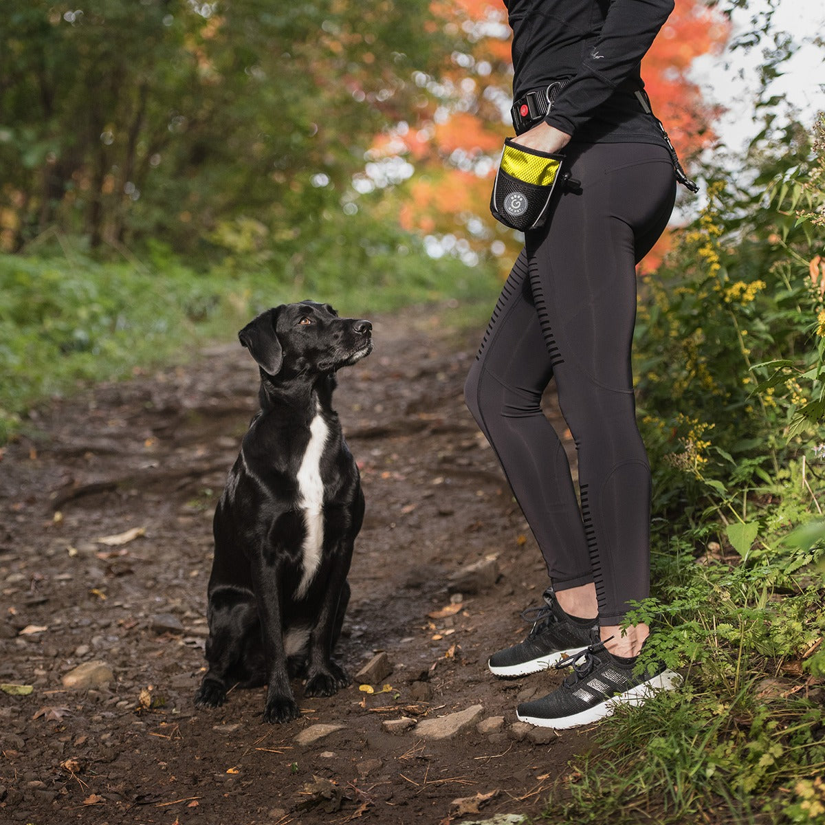 The GF PET® Treat Bag is perfect for training, travelling, camping, hiking and every day walking! Made from quality polyester ripstop & oxford, with extra inside and outside pockets, and a secure drawstring closure to keep treats from falling out. Reflective piping for added safety. Includes carabiner clasp and secure beltloop to attach to belt, lead or backpack for handsfree use. Just fill, attach and go!