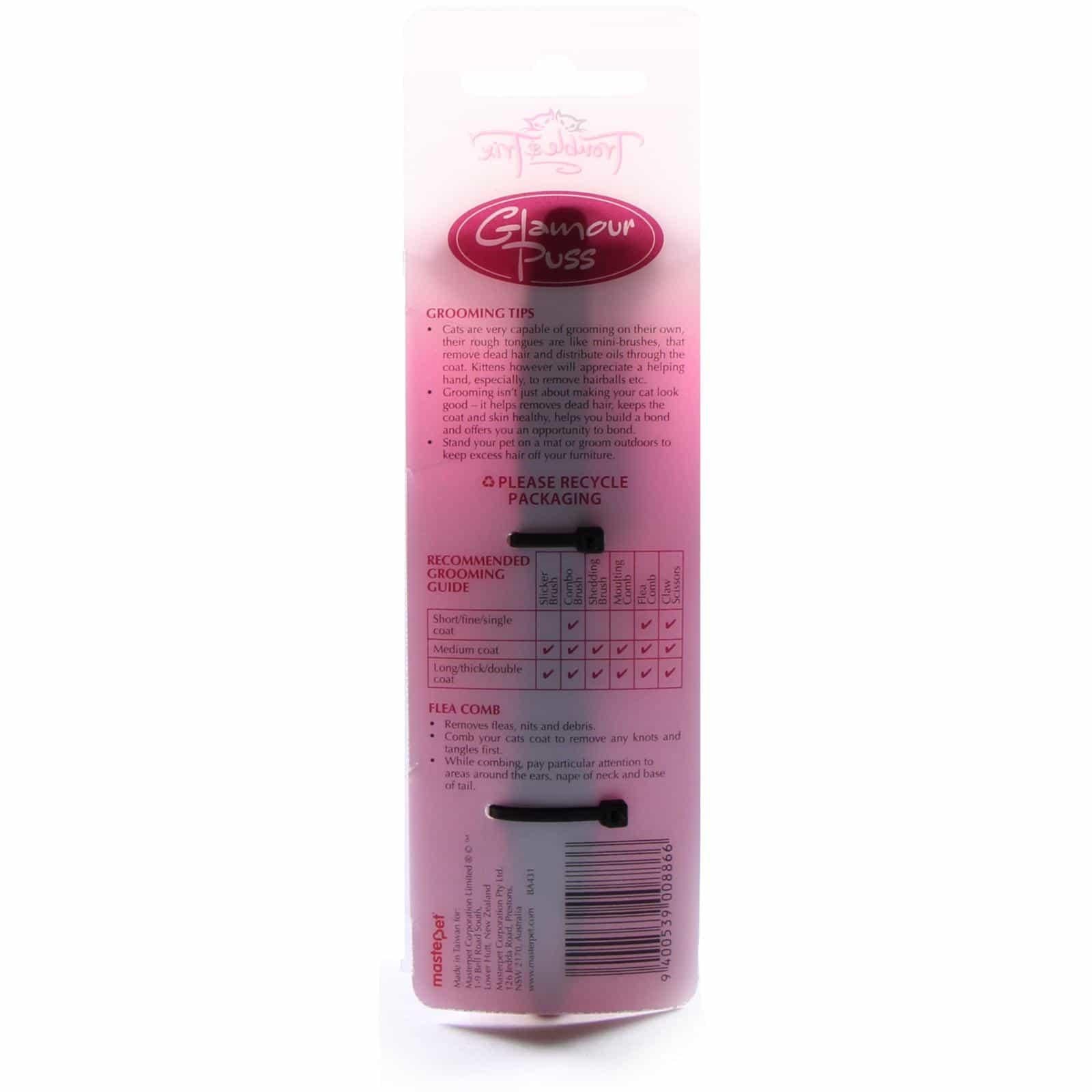 The GlamourPuss flea comb is a great way to remove unwanted fleas and debris in your cat's coat. For best results comb your cat's coat to remove any knots and tangles first. While combing, pay particular attention to areas around the ears, nape of neck and base of tail.