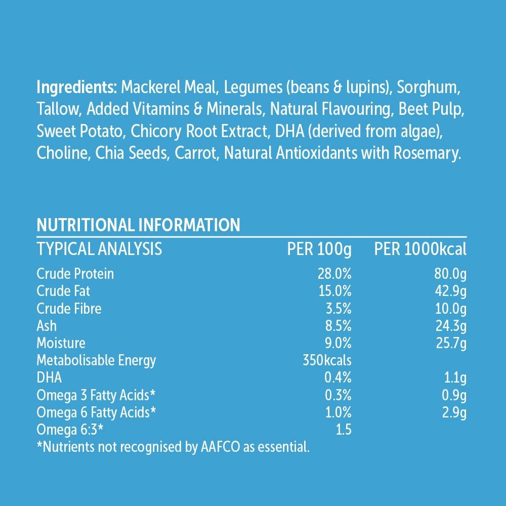 GLOW Adult Dog Food- Mackerel is formulated with ingredients sourced in Australia, protein rich whole mackerel along with carrots for healthy eyesight, green beans for a wholesome source of vegetable protein and sweet potato which is gentle on the digestive system.