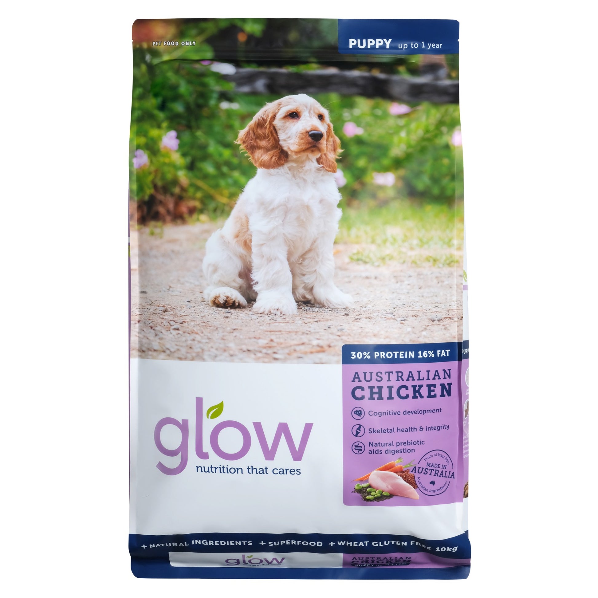 Glow Puppy Food Chicken is formulated with Australian sourced, protein rich chicken along with chia seeds for skin and coat health, sorghum as a wheat gluten free source of energy and green beans for a wholesome source of vegetable protein.
