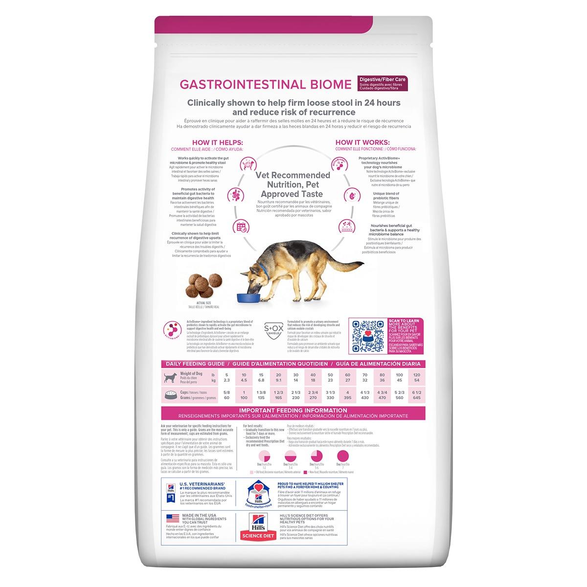 Hill Prescription Diet Gastrointestinal Biome is a high-fibre dry dog food with a proprietary blend of prebiotics clinically shown to help firm loose stool in 24 hours and reduce risk of recurrence. It is specially formulated to promote healthy stool and support overall digestive health. It is made in the USA with global ingredients you can trust, and was developed specifically for GI care by Hill nutritionists and veterinarians. This food also promotes a urinary environment that reduces the risk of developing struvite and calcium oxalate crystals. Please consult your veterinarian for further information on how Hills Prescription Diet foods can help your dog continue to enjoy a happy and active life.