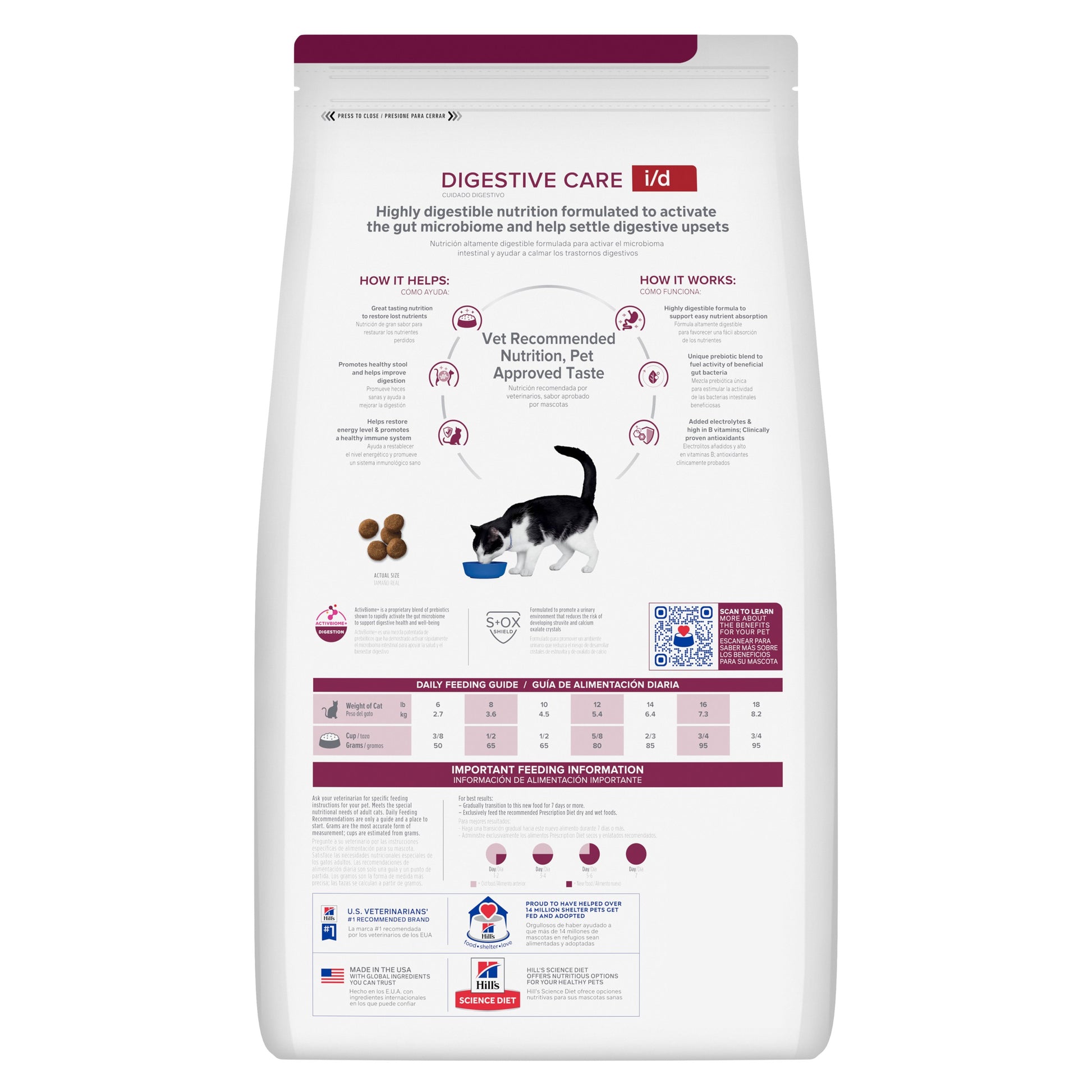 Hill Prescription Diet i/d Digestive Care Dry Cat Food is great tasting highly digestible nutrition clinically shown to help settle digestive upsets in cats. This dry cat food contains electrolytes and B vitamins to help replace lost nutrients. It also has clinically proven antioxidants for a healthy immune system and omega 3 6 fatty acids. Plus, this highly digestible formula helps ensure easy nutrient absorption. It meets the special nutritional needs of kittens and adult cats. It made in the USA with global ingredients you can trust, and was developed by Hill nutritionists and veterinarians. Please consult your veterinarian for further information on how Prescription Diet foods can help your cat continue to enjoy a happy and active life.