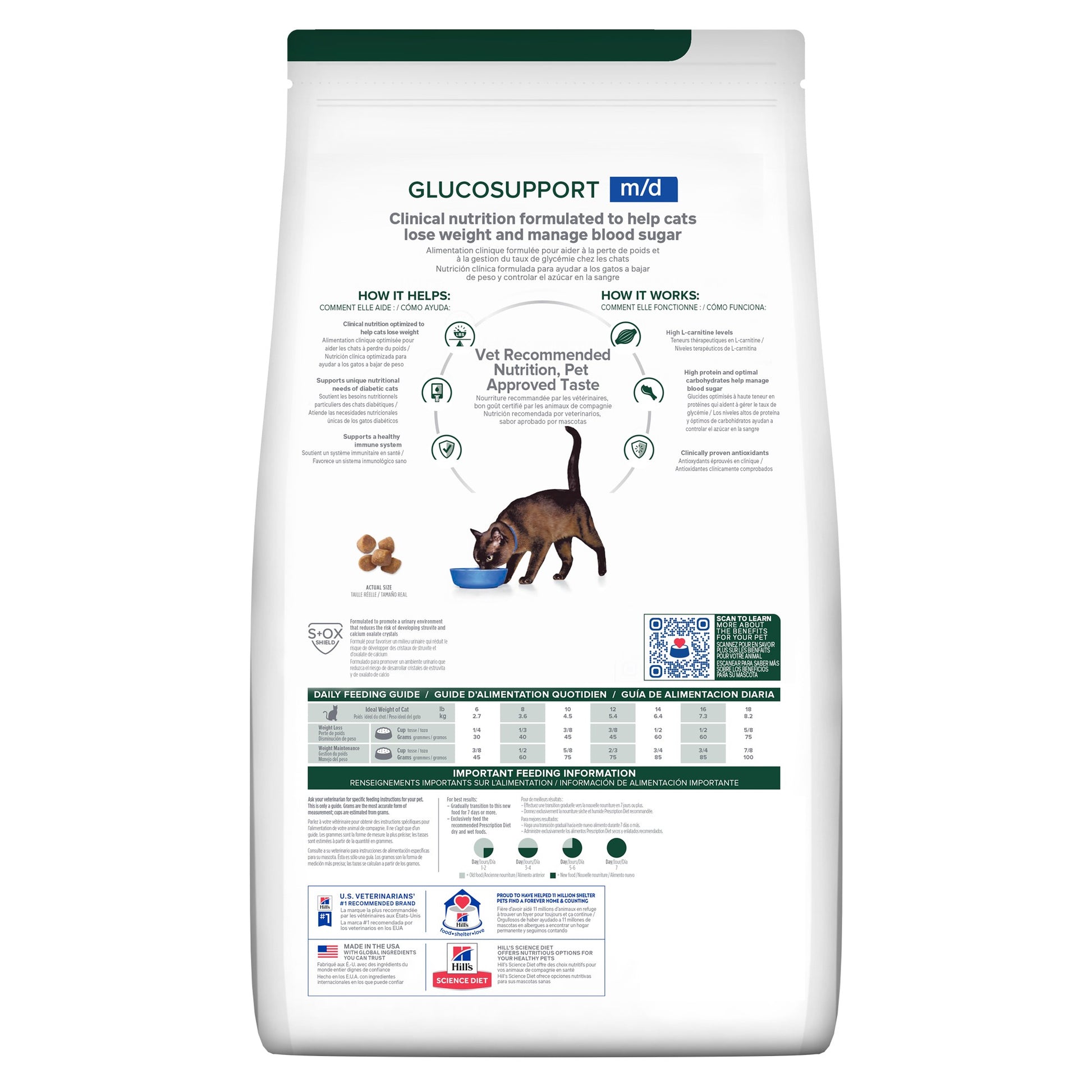 Hill's Prescription Diet m/d GlucoSupport is clinical nutrition tested to manage glucose and weight for cats. It’s made in the USA with global ingredients you can trust, and was developed by Hill’s nutritionists and veterinarians. This food is also formulated to promote a urinary environment that reduces the risk of developing struvite and calcium oxalate crystals.
