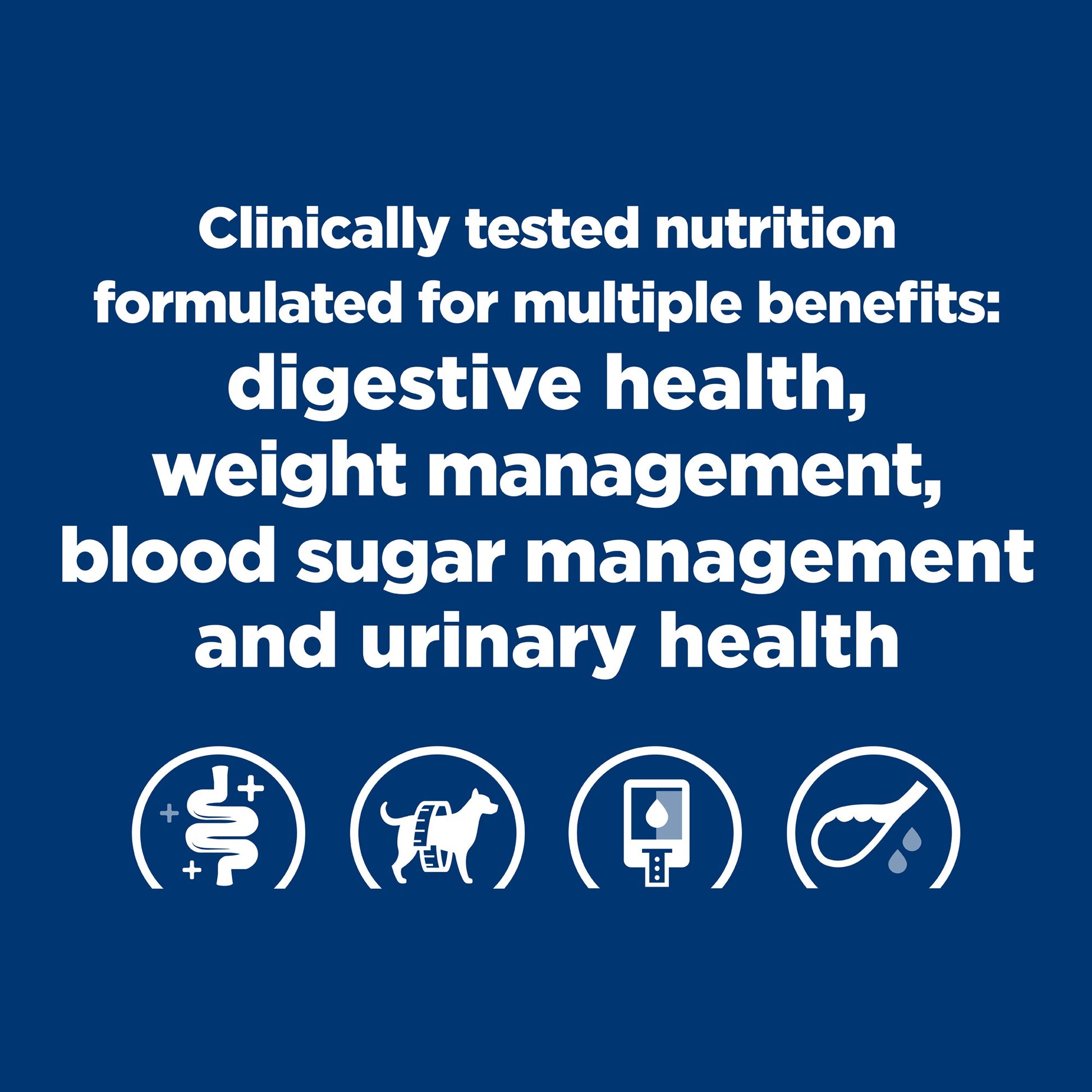When your pet is experiencing multiple conditions at once, they are often although not always interconnected. That's why Hills Prescription Diet w/d is uniquely formulated to benefit your pet on multiple levels: urinary health, digestive health, blood sugar management and weight management. This blend of balanced nutrients and soluble and insoluble fibres works on multiple fronts to get your pet live their best life.
