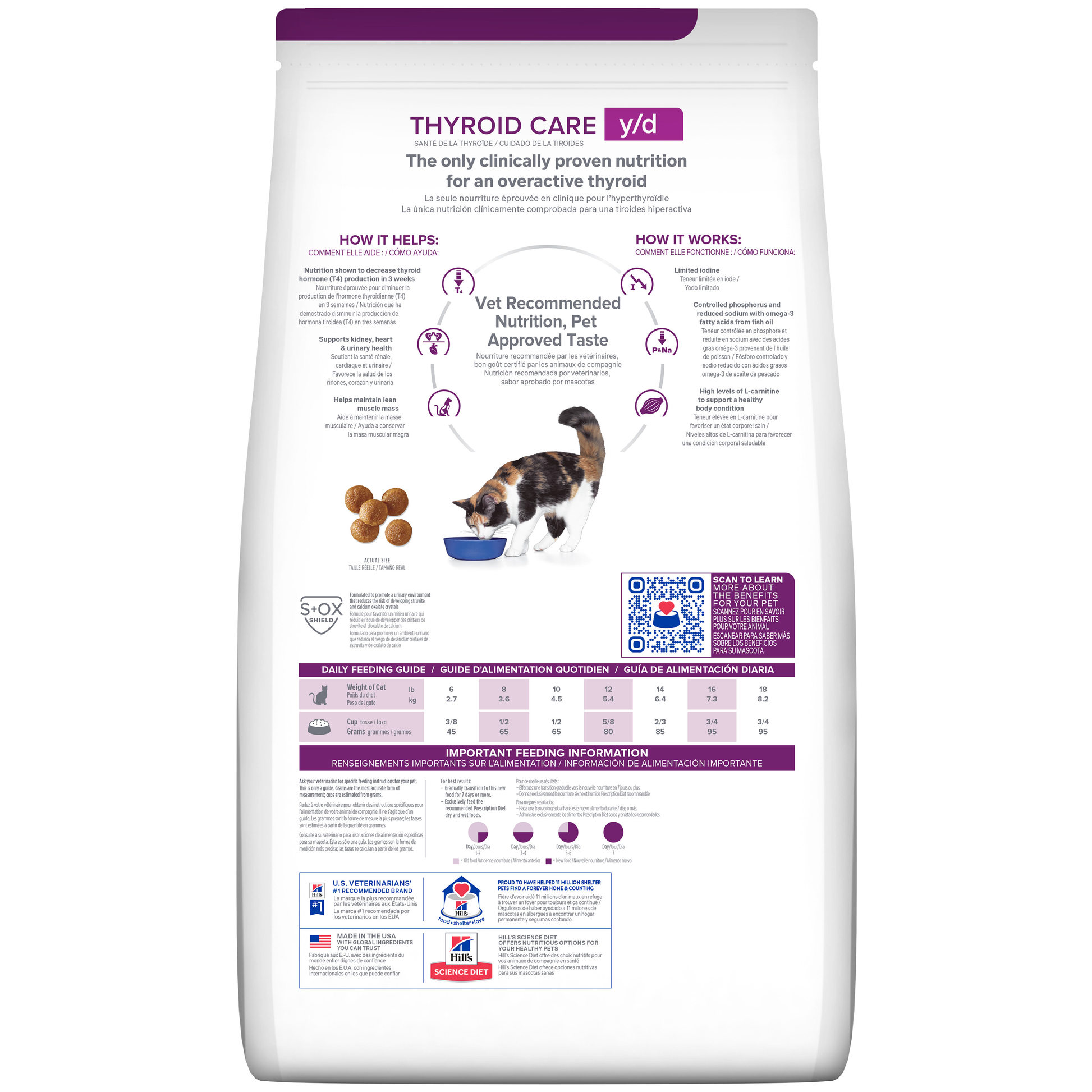 Hills Prescription Diet y/d Dry Cat Food is an easy and convenient way to help manage thyroid health and reduces excess thyroid hormone production when fed as the sole source of nutrition. It made in the USA with global ingredients you can trust, and was developed by Hill nutritionists and veterinarians. This food is also formulated to promote a urinary environment that reduces the risk of developing struvite and calcium oxalate crystals. Please consult your veterinarian for further information on how Prescription Diet foods can help your cat continue to enjoy a happy and active life.