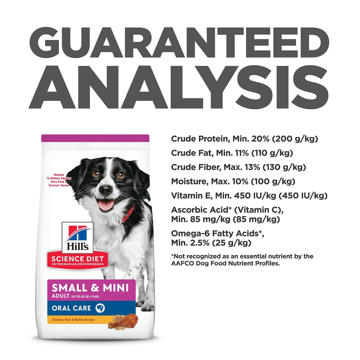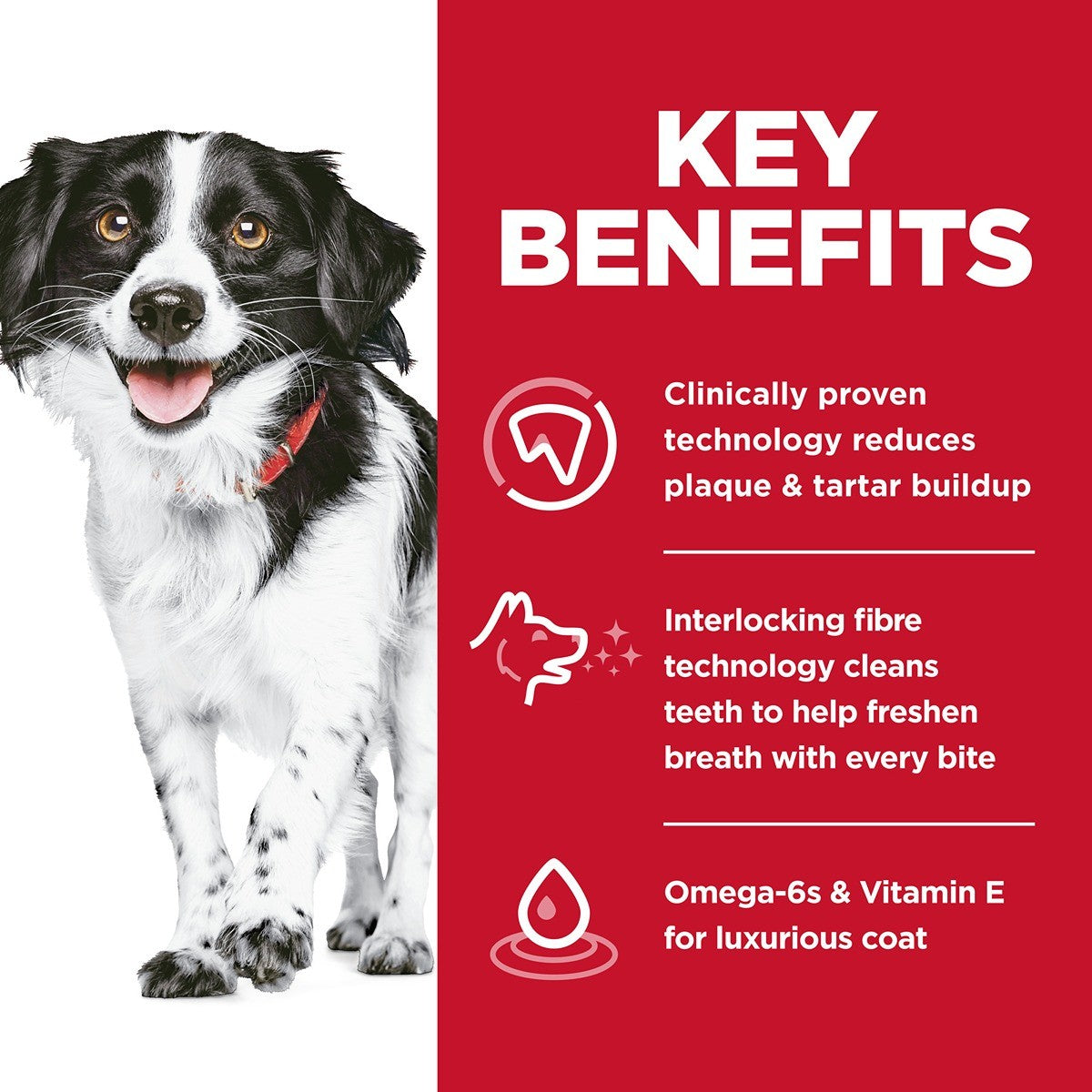 With clinically proven interlocking fibre technology, Hill's unique Oral Care kibble works to clean dogs' teeth to help freshen breath with every bite. Plus, this premium dog food made with high quality ingredients has Omega-6 fatty acids & Vitamin E to help your grown dog keep a healthy coat and skin each and every day. This specially-formulated nutrition was developed with state-of-the-art technology to create a great-tasting dog food your small adult dog can truly enjoy.