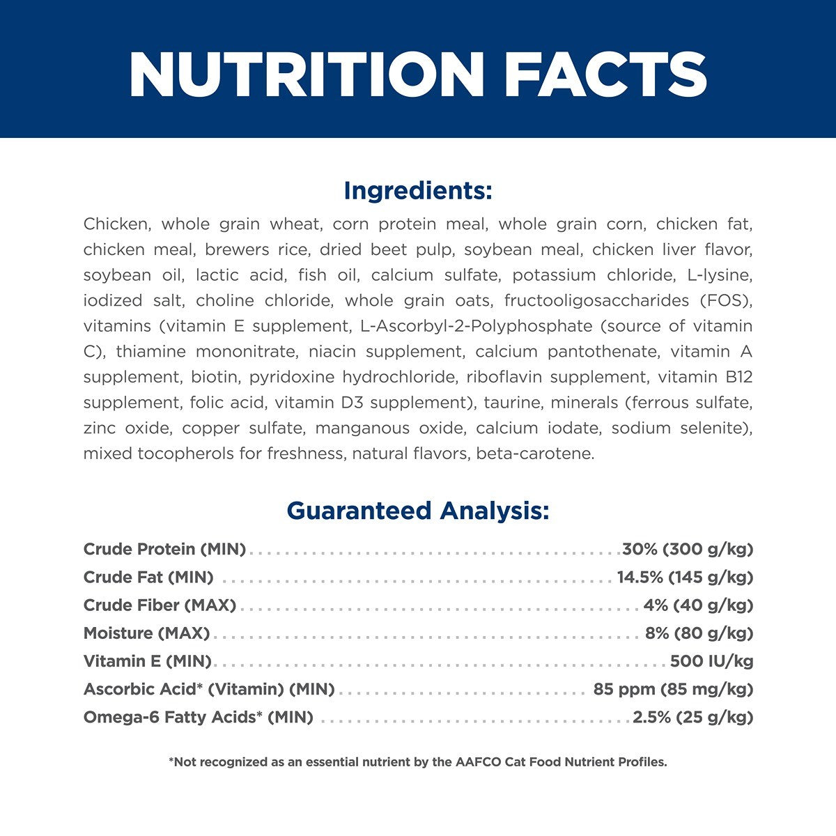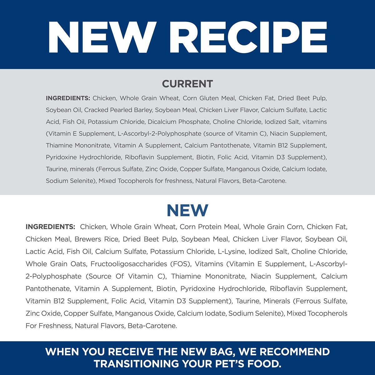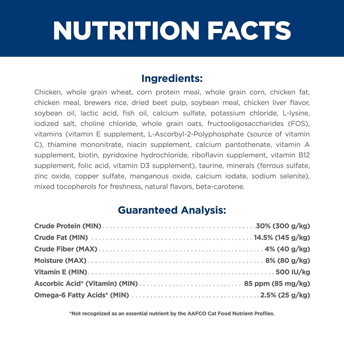 Hill's Science Diet Adult dry cat food is made with high-quality, easy-to-digest ingredients and is specially formulated to fuel the energy needs of cats during the prime of their life. Hill's Science Diet Adult nourishes cats' skin and is packed with high-quality protein to help cats maintain lean muscles. Now there is even more to love with a special blend of prebiotic fibres and antioxidants, ActivBiome+ Multi-Benefit, to support digestion, immune system and organ health.