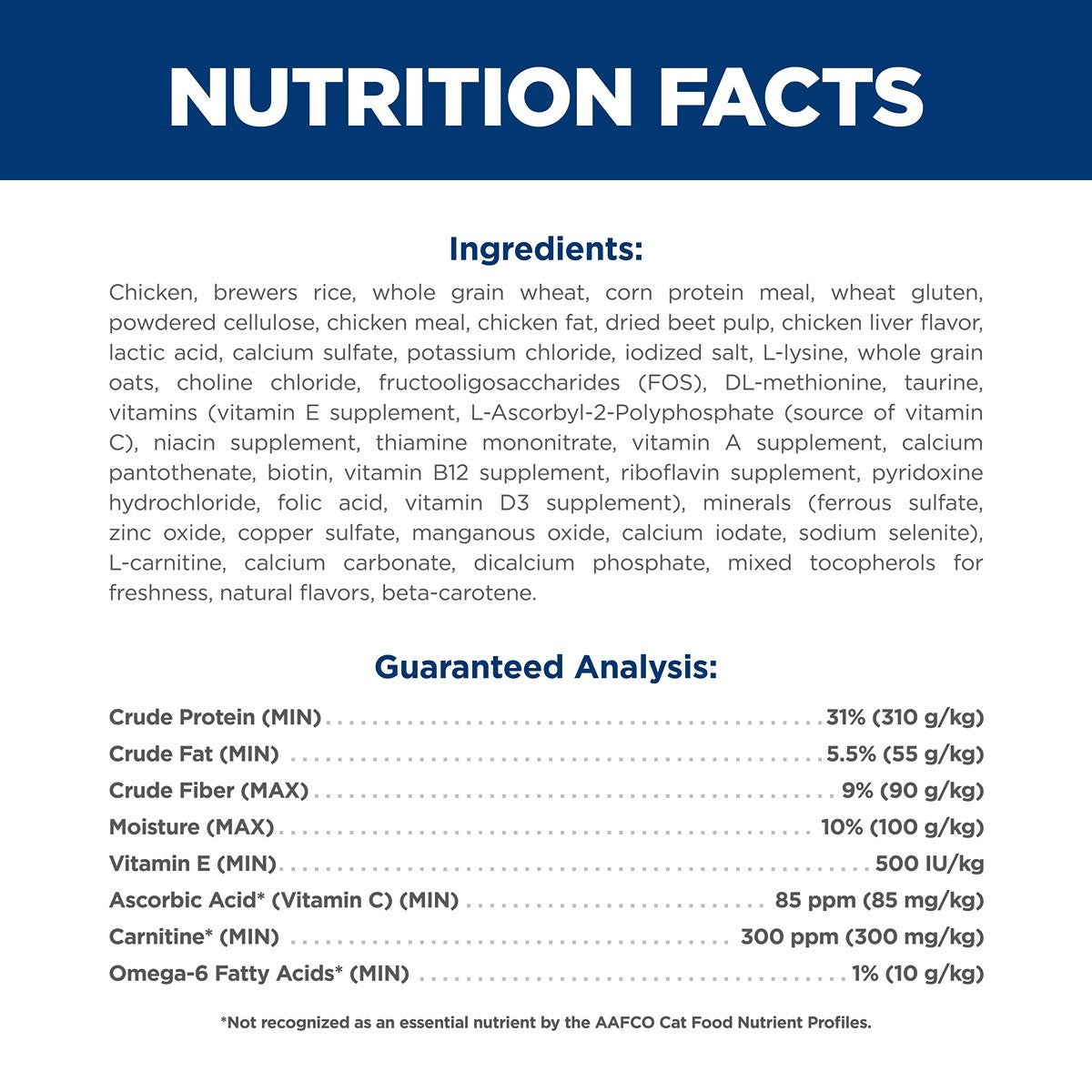 This cat food made with natural ingredients provides 20% fewer calories vs. Hill's Science Diet Adult, along with L-Carnitine to help support an ideal body weight in your grown cat. The quality protein and natural fibres help support your Adult cat's hunger between meals, while vitamin E and omega-6 fatty acids promote shiny fur and nourish the skin. Plus there is even more to love with a special blend of prebiotic fibres and antioxidants, ActivBiome+ Multi-Benefit, to support digestion, immune system and organ health.