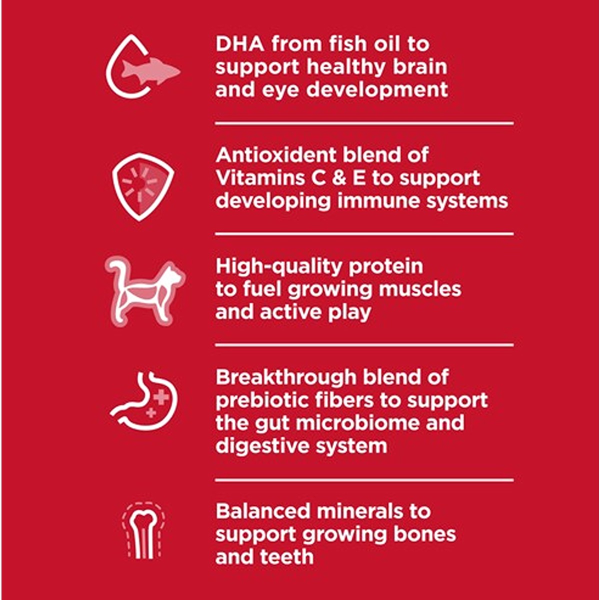 Your little kitten needs premium nutrition that can keep up with their active lifestyle. That's why Hill's Science Diet Kitten dry food is specially formulated with vital nutrients to support 5 essential building blocks for lifelong health, so they get the best start in life & grow to their full potential. This cat food provides DHA from fish oil for healthy eye & brain development for kittens and high-quality protein to fuel your growing cat's muscles and active play. With balanced minerals that promote strong bones and strong teeth.