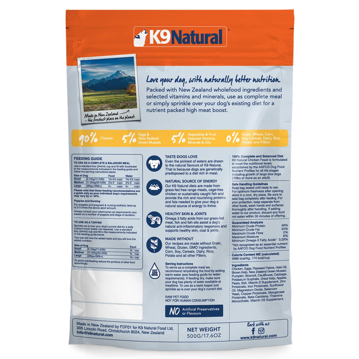 Our freeze-dried Chicken Feasts are expertly crafted for whole-body health, and made with 94% cage-free chicken and organs, along with green-lipped mussels, vitamins and minerals. Packed with New Zealand wholefood goodness, providing a natural diet rich in protein and nutrients for a happy, healthy dog.