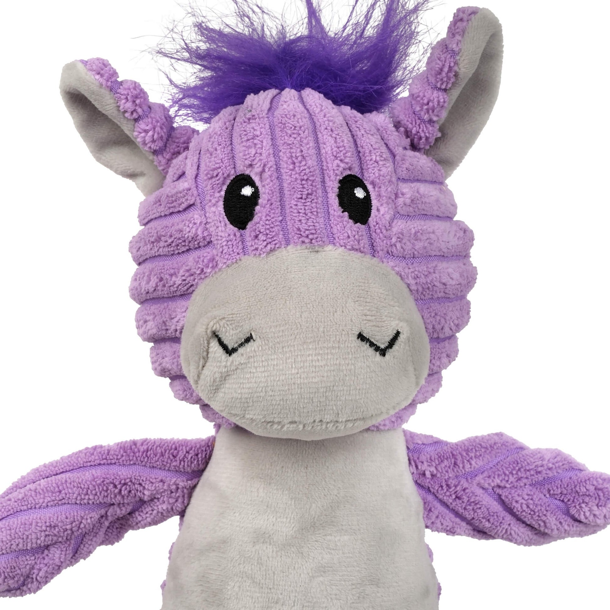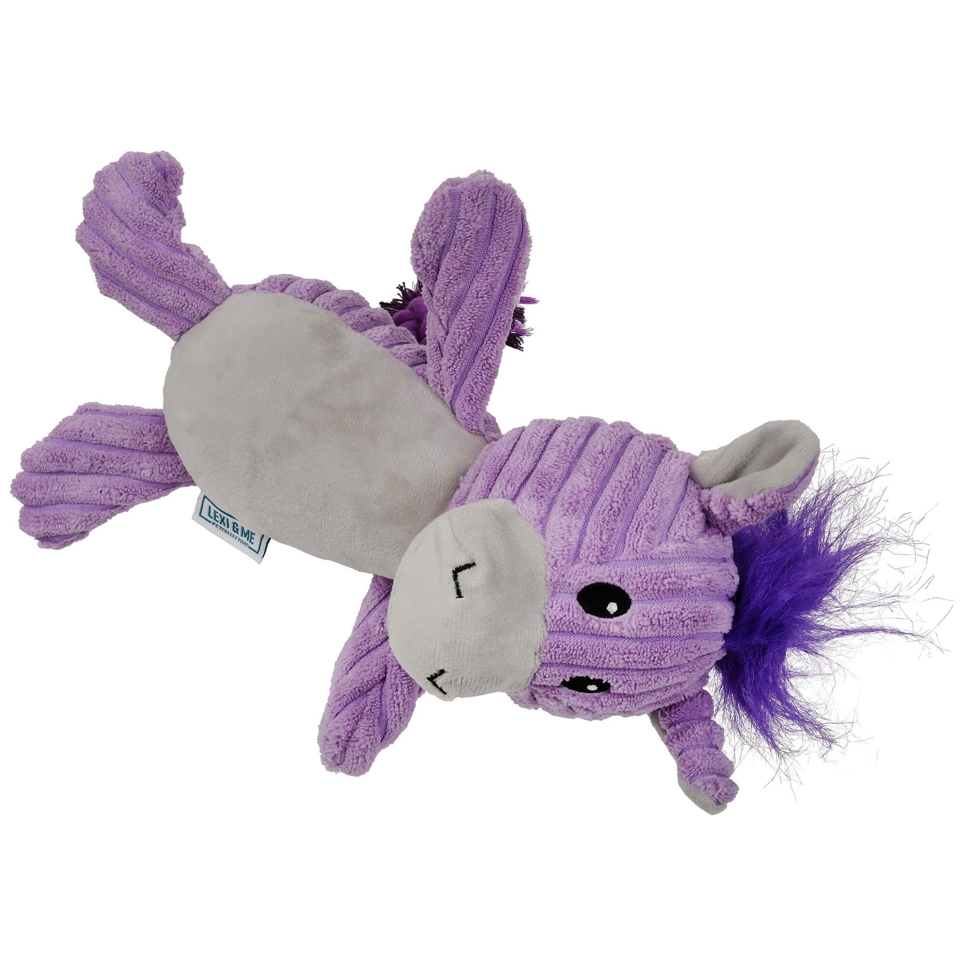The Lexi & Me Donkey Plush/Rope Toy is a playful and engaging toy for your dog. Featuring a fun purple design, it combines multiple textures and materials, including stimulating crinkle and a squeaker for extra excitement. Filled with 100% post-consumer recycled polyester, it’s built for hours of entertainment. Your dog will love tugging, chewing, and playing with this toy.