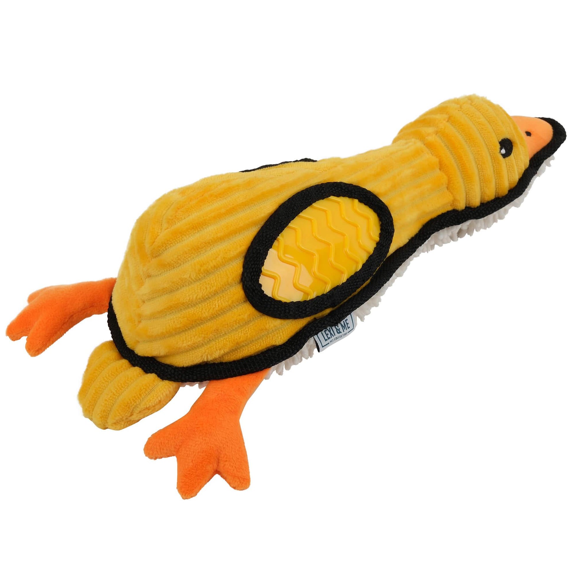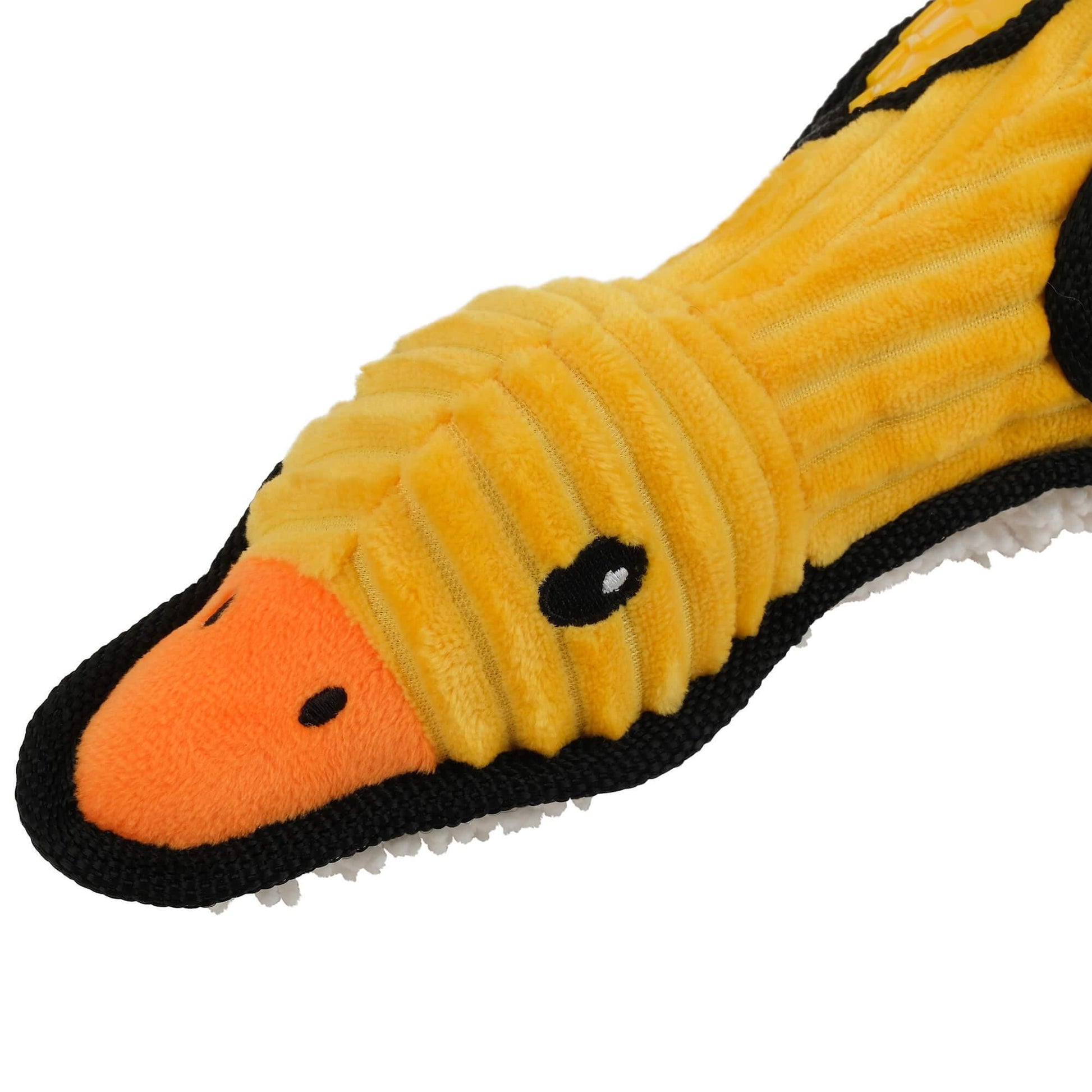 An engaging dog toy with a squeaker, crinkle material & multiple textures including rubber for playtime.
