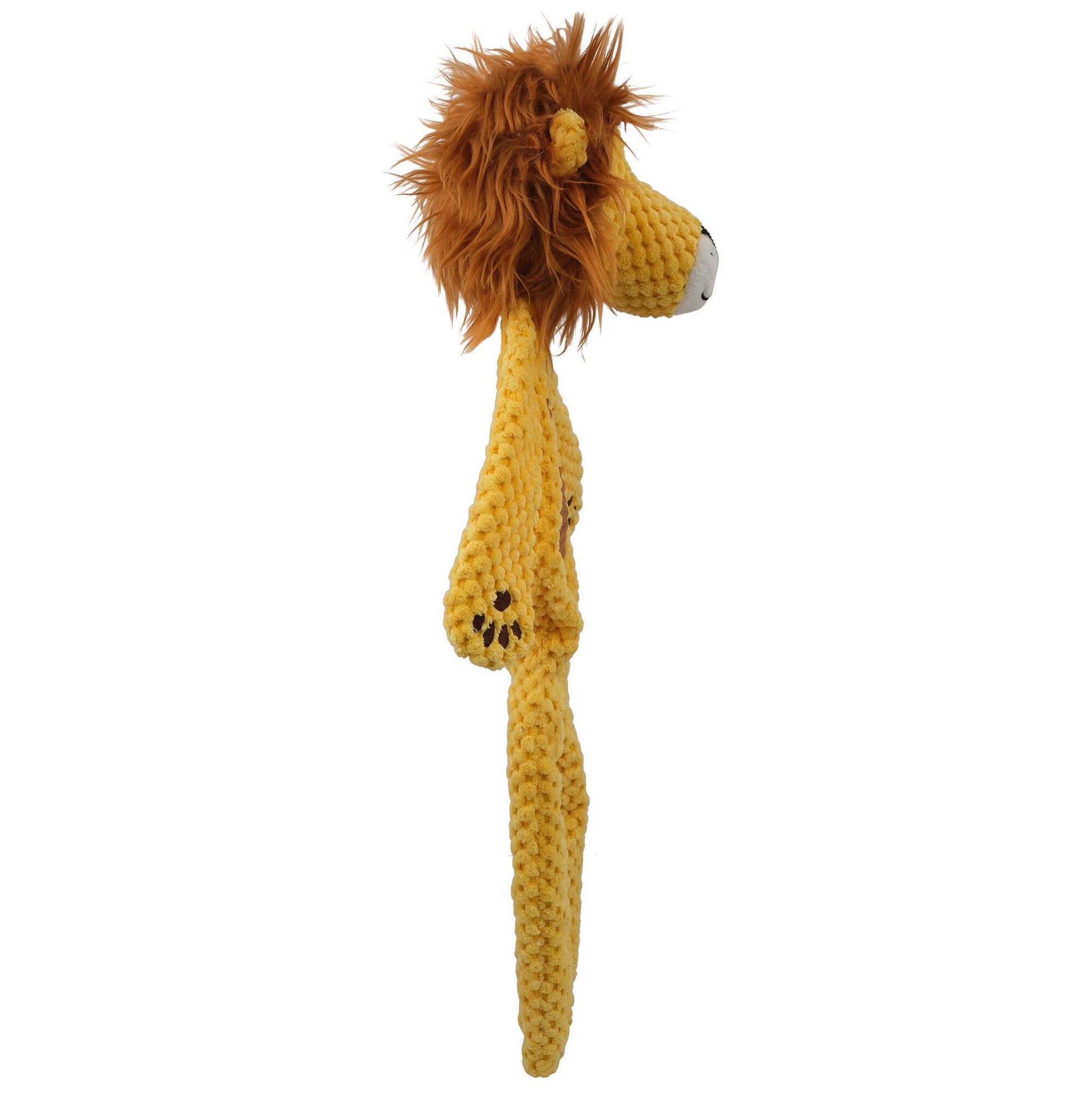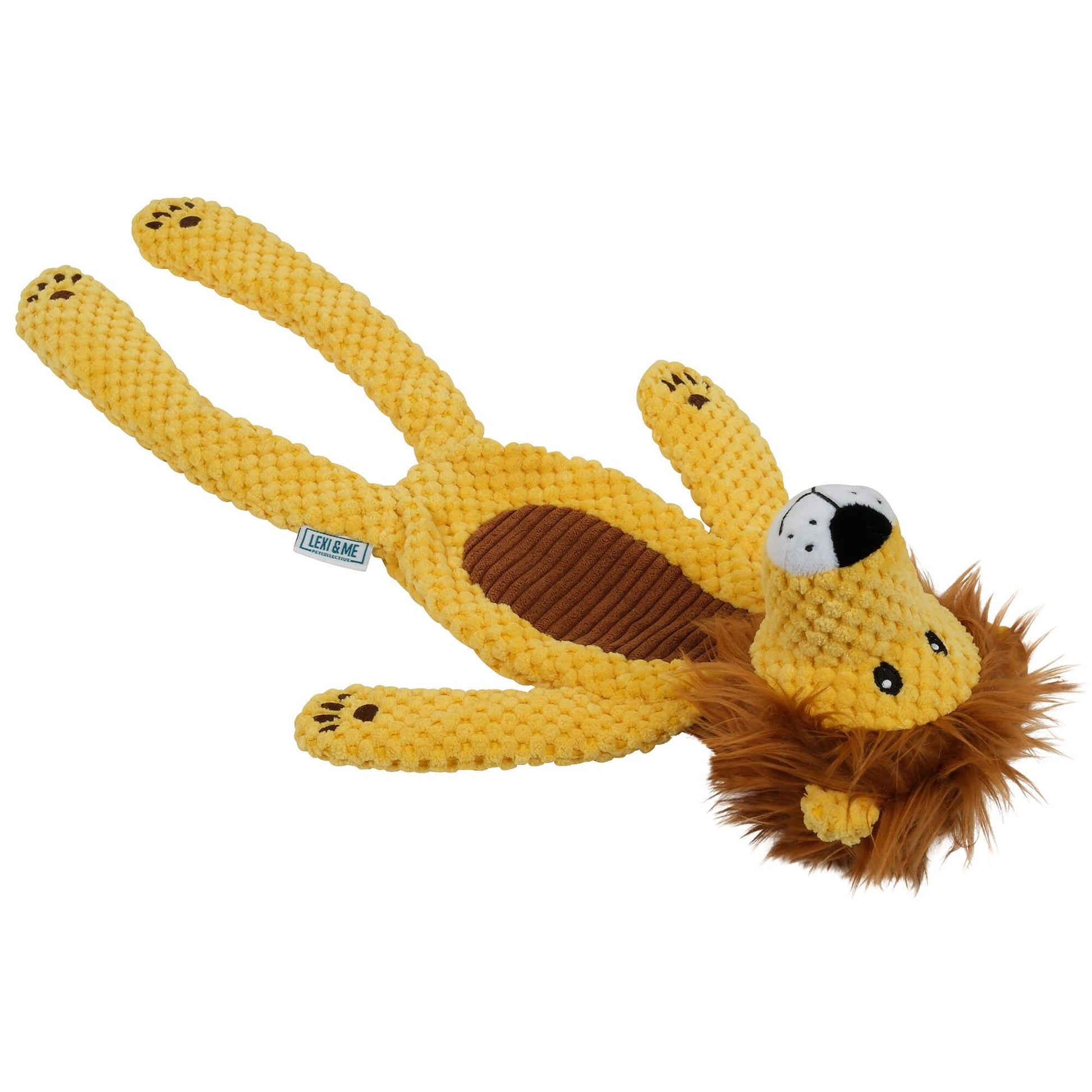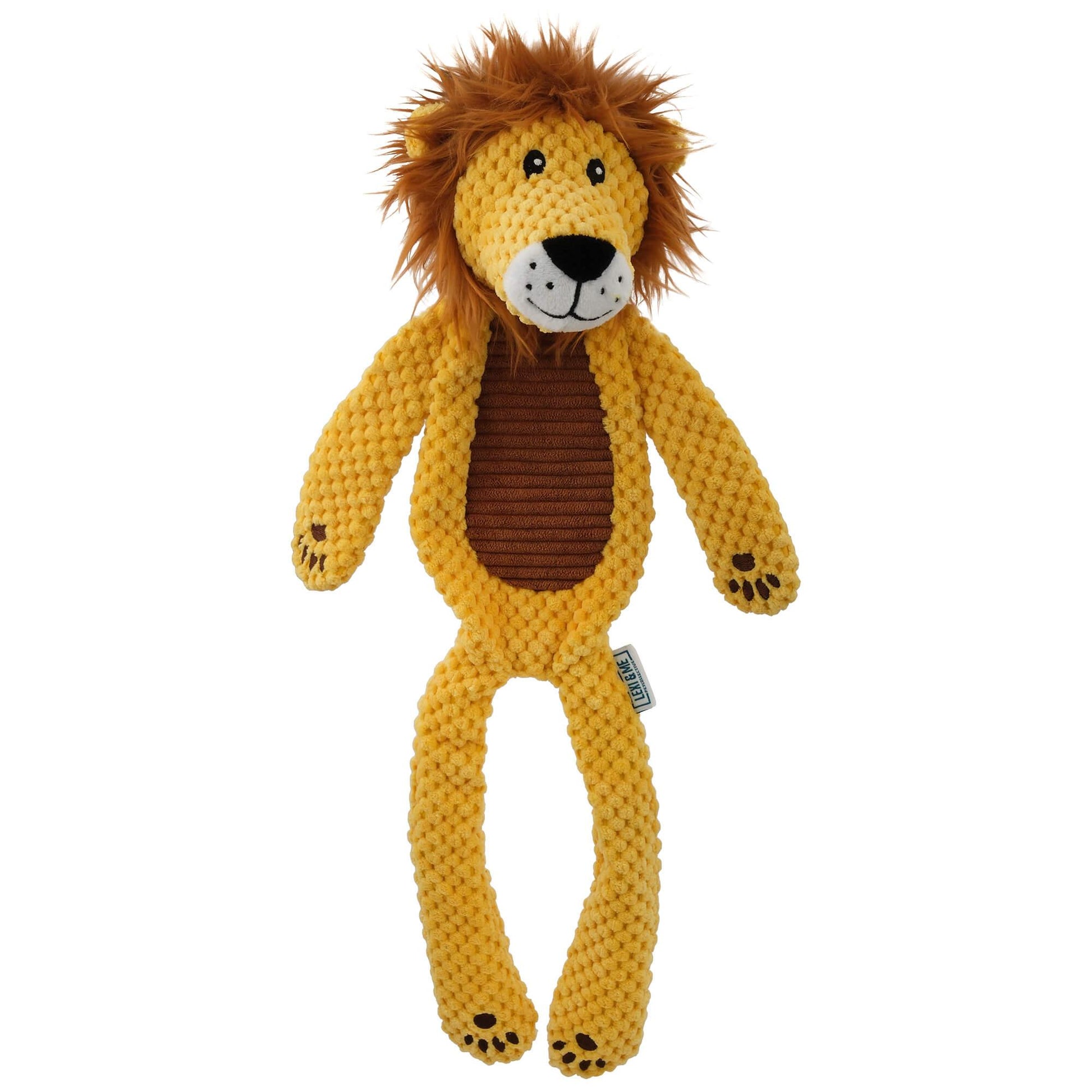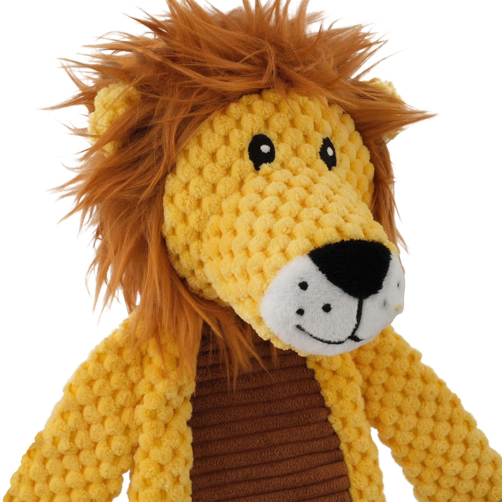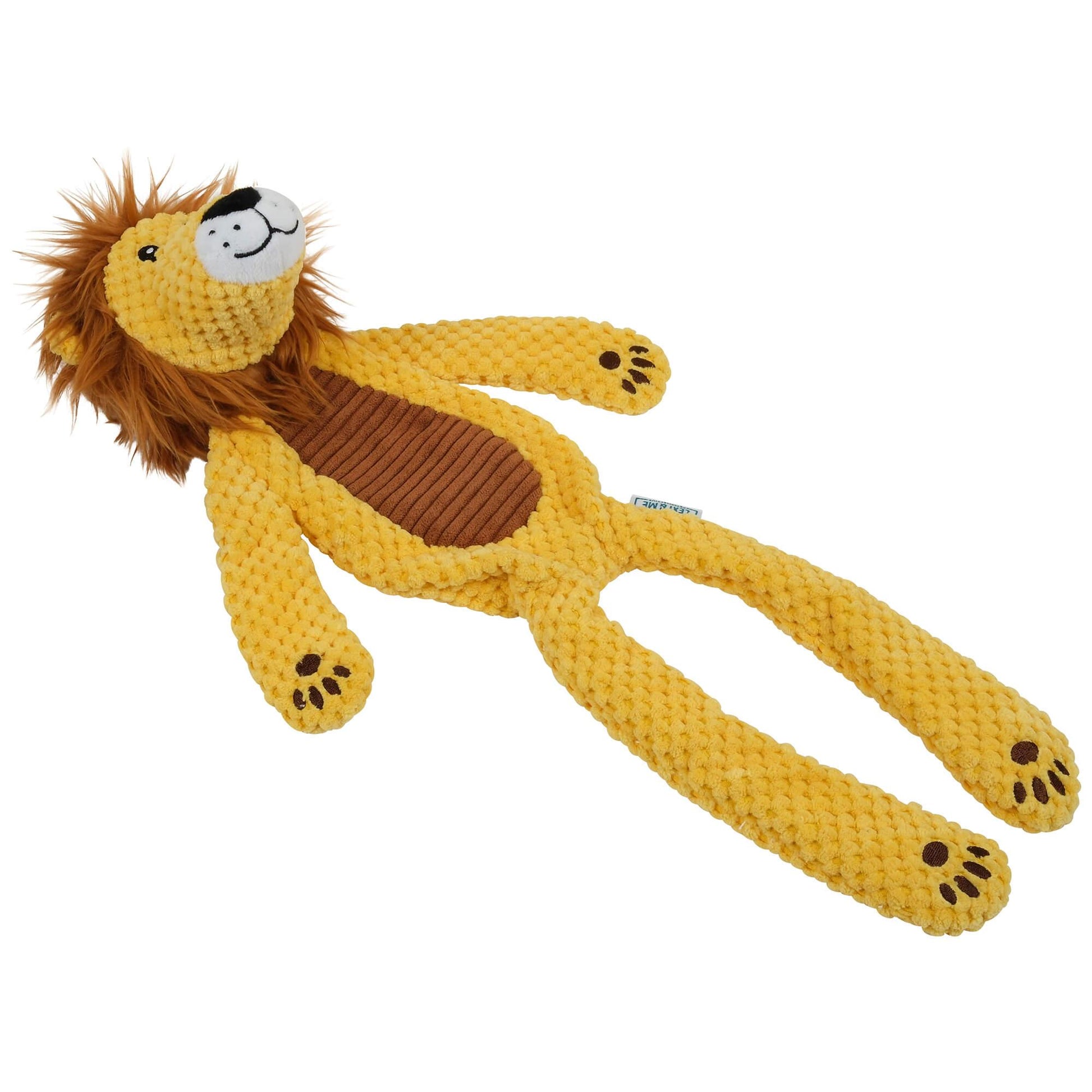 This lion toy squeaks, crinkles and features multiple textures including textured plush. Designed with minimal fill and built-in rope legs, it is the ultimate playtime companion.