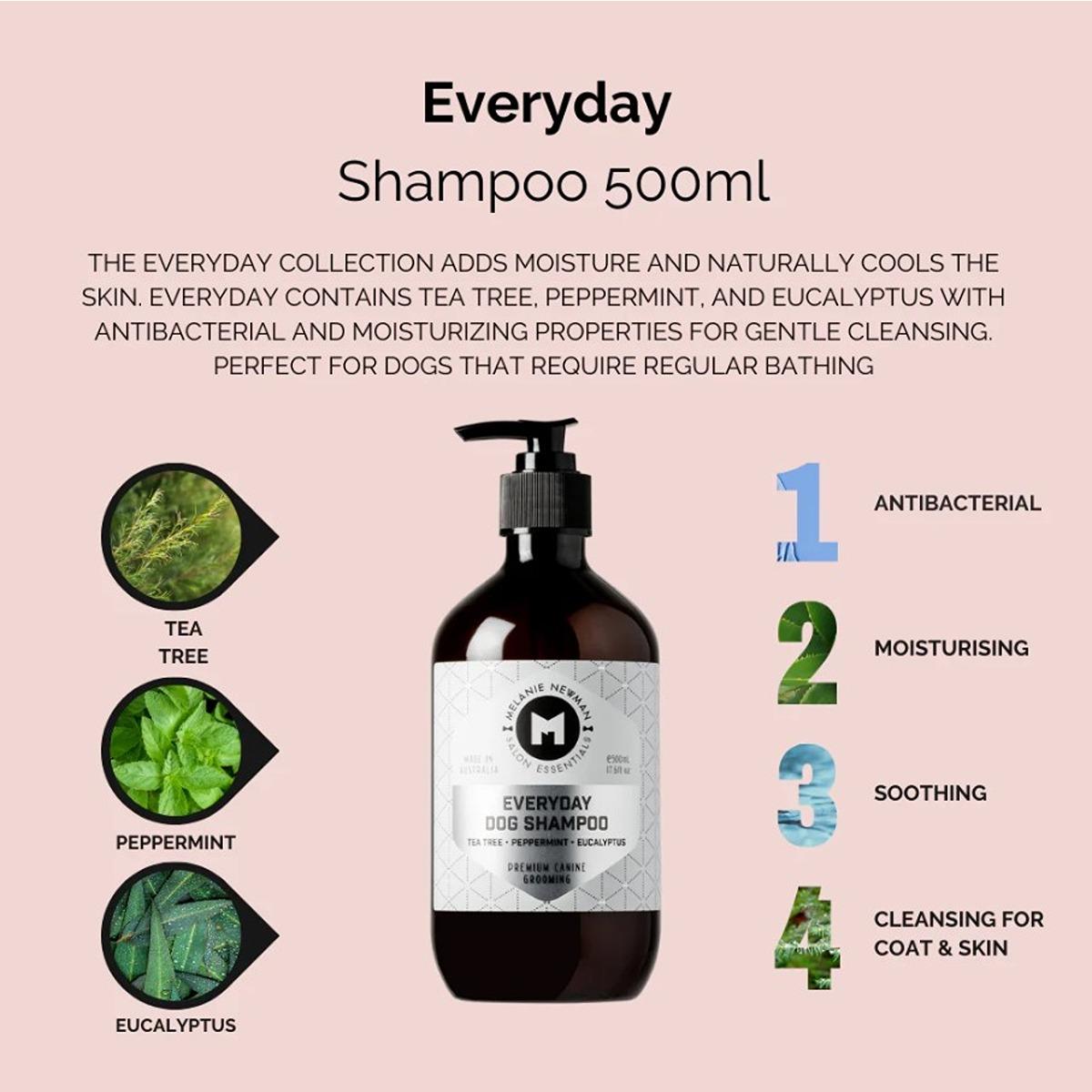 The Melanie Newman Everyday Shampoo is a 100% pure and natural pH balanced, pet friendly shampoo that contains no SLS or parabens, petro-chemicals or synthetic perfumes. The Everyday Shampoo contains conditioning oils that are enriched with vitamins and organic essential oils, Tea Tree, Peppermint and Eucalyptus that provide a clean, fresh smelling coat with a natural shine.