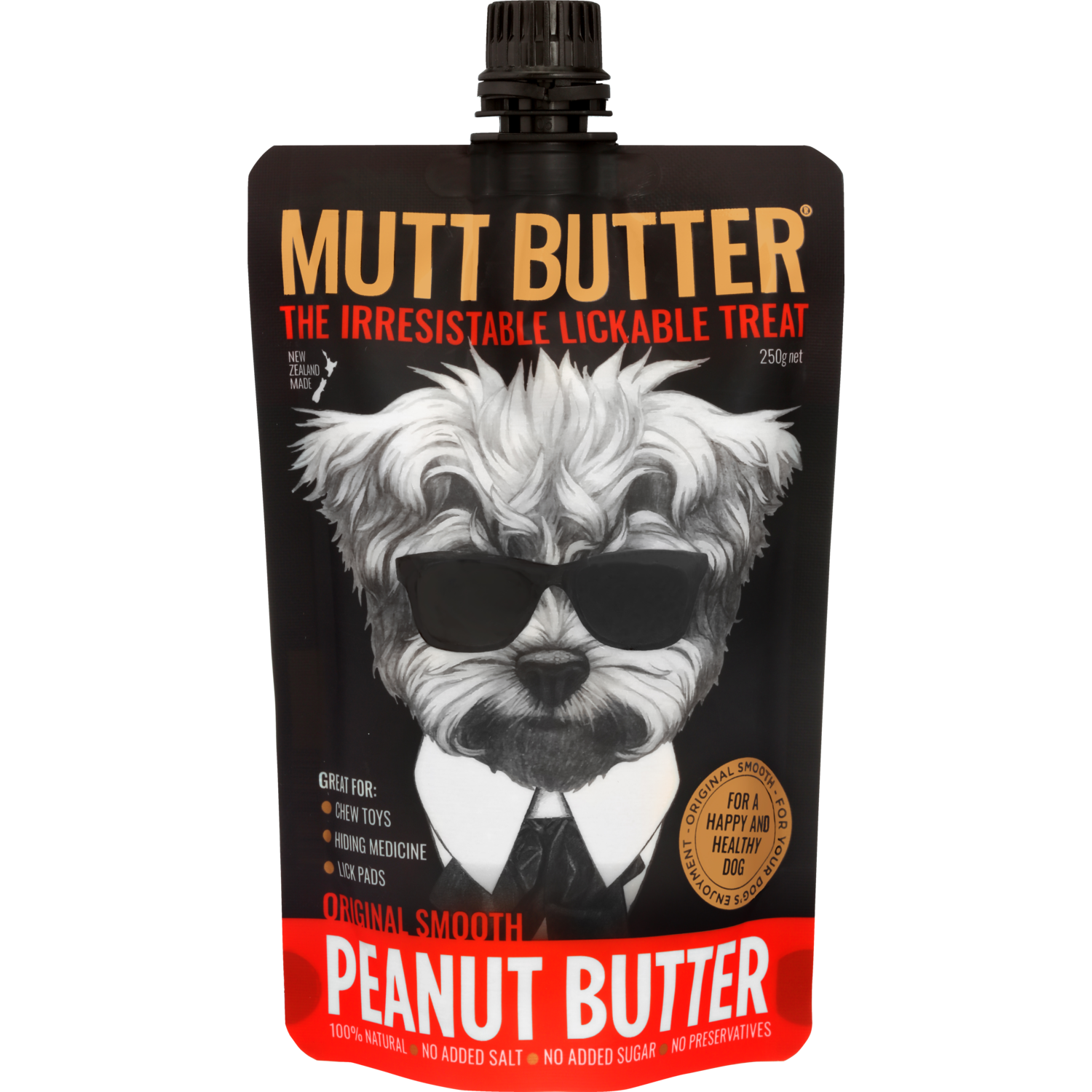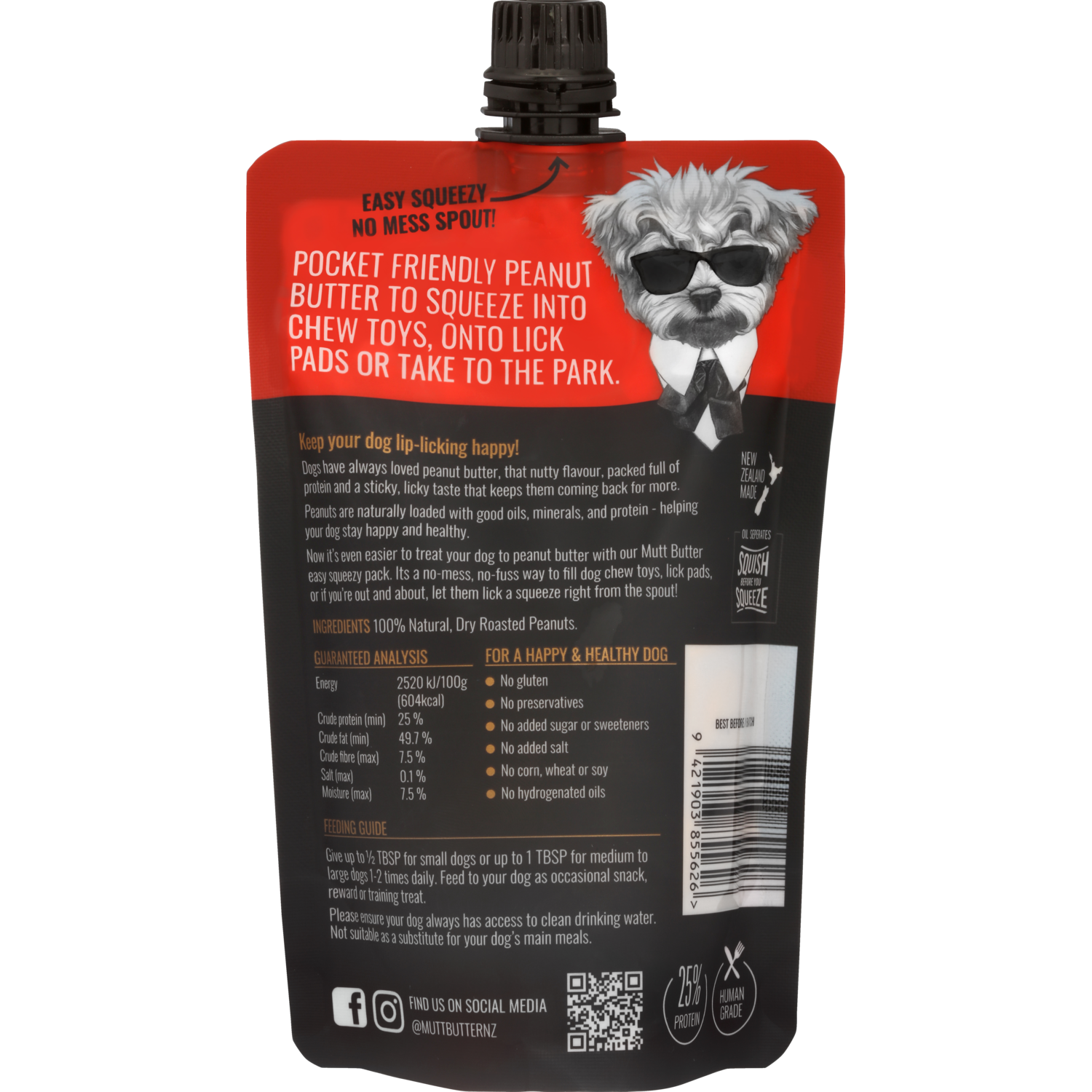 Made in NZ Mutt Butter Squeezy Peanut Butter is 100% natural peanut butter with no added salt or sugar. Avalaible in a squeezy pouch, it is super convinent and easy to use. Peanuts are naturally loaded with good oils and minerals; they have 25% protein which, along with the oils, aids your dogs overall health.