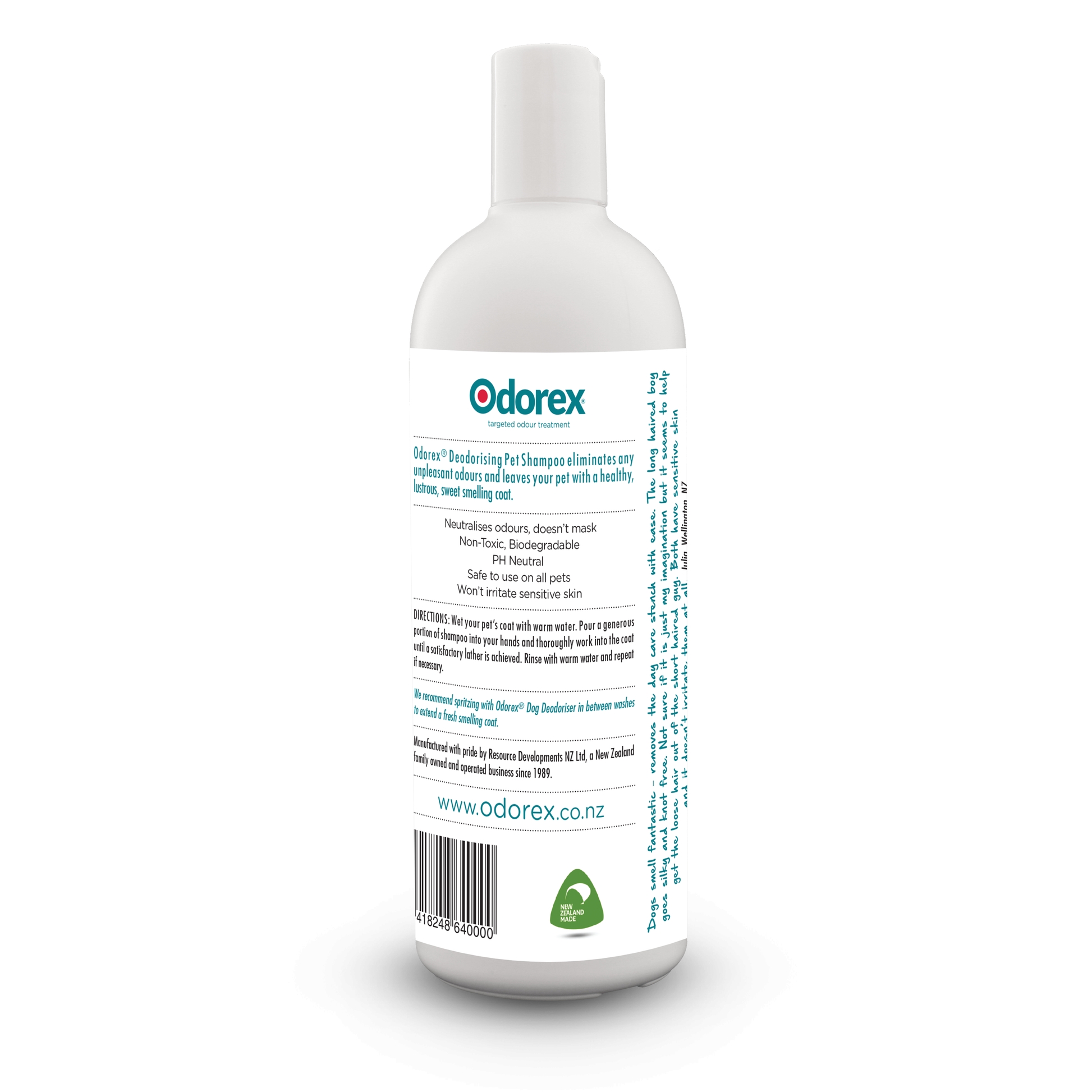 Odorex Deodorising Pet Shampoo is a NZ made gentle, safe shampoo with odour neutralisers that eliminate smelly pet coats. We recommend you use Odorex Dog Deodoriser in-between washes to freshen up your pets coat.