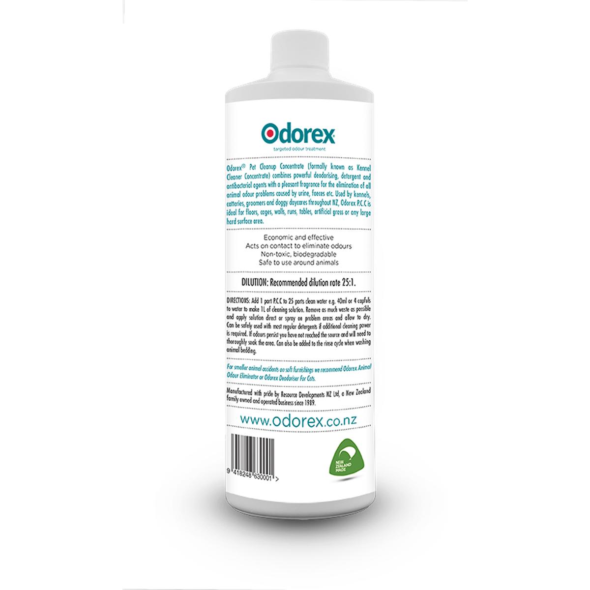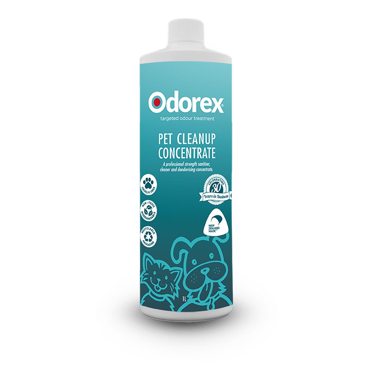 Odorex Pet Cleanup Concentrate is a NZ made professional strength sanitiser, cleaner and deodorising concentrate. It combines deodorising, detergent, antibacterial agents and a pleasant fragrance for the elimination of all animal odour problems caused by urine, faeces etc. Ideal for floors, cages, walls, runs, tables, artificial grass, any large area.For smaller areas you can use Odorex Cat Odour Eliminators or Odorex Animal Odour Eliminator. For difficult to find odours we recommend the Odorex Pet Urine Stain Detector.