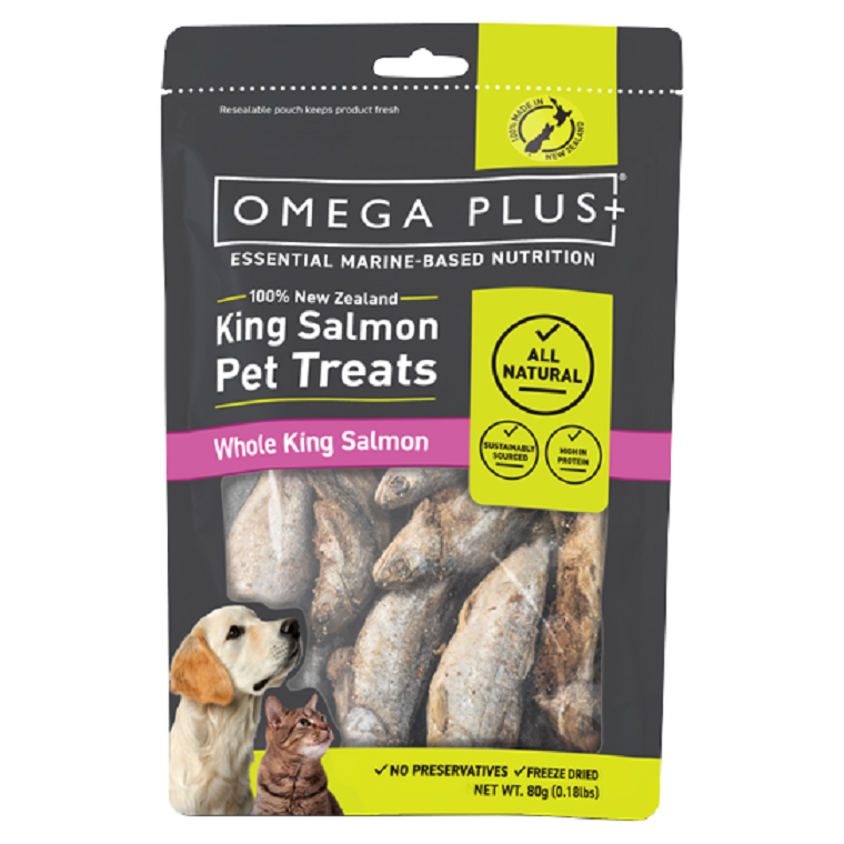 Omega Plus Pet Treat Whole King Salmon come from 100% New Zealand King salmon and are all natural. These Whole King Salmon are freeze-dried to ensure a longer lasting product while also capturing all the health benefits that pure New Zealand King salmon provides. King salmon boasts high levels of omega-3 and omega-6 which have a range of health benefits for your cat and dog, including improvements in skin and coat health and joint mobility.