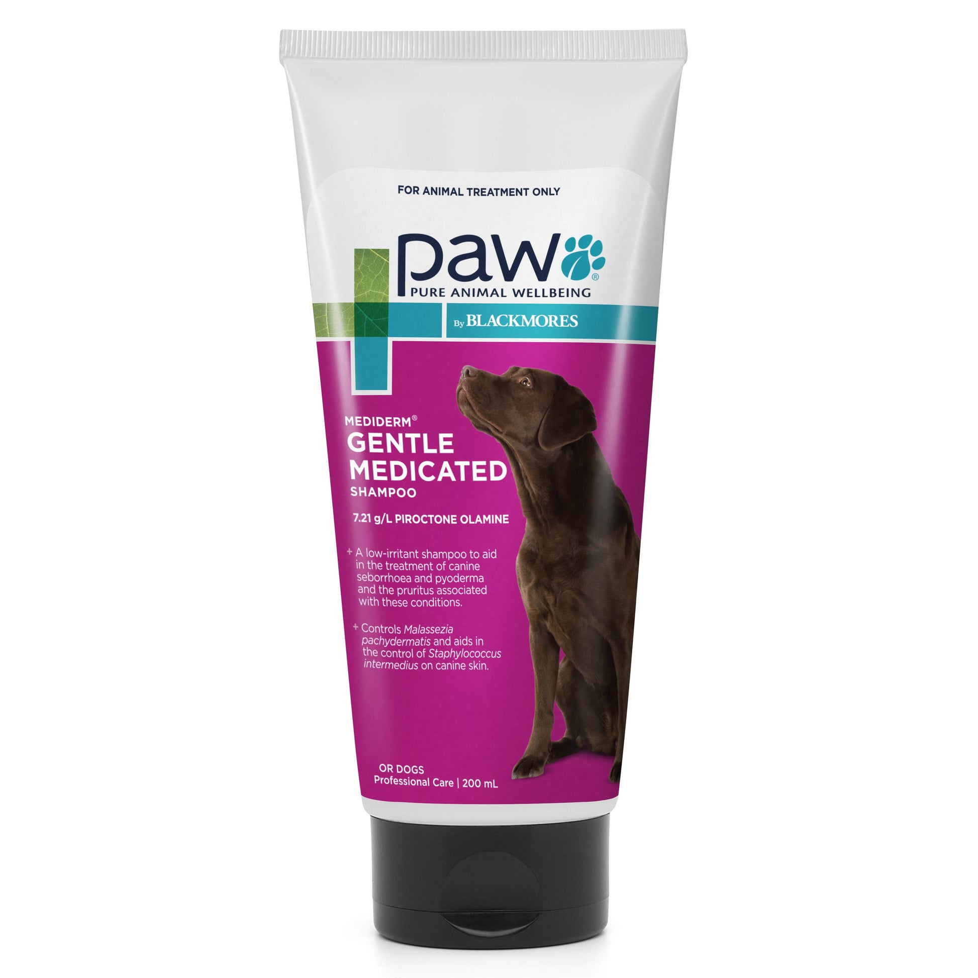 PAW Mediderm Shampoo is a gentle antibacterial and anti fungal medicated shampoo that contains the veterinary active ingredient Piroctone Olamine and sulphate free cleansers making it ideal for the management of long term recurrent skin infections. It is clinically proven to treat superficial dermatitis, pyoderma and seborrhoea, control Staphylococcus intermedius and Malassezia pachydermatis, and remove scaly skin and grease.