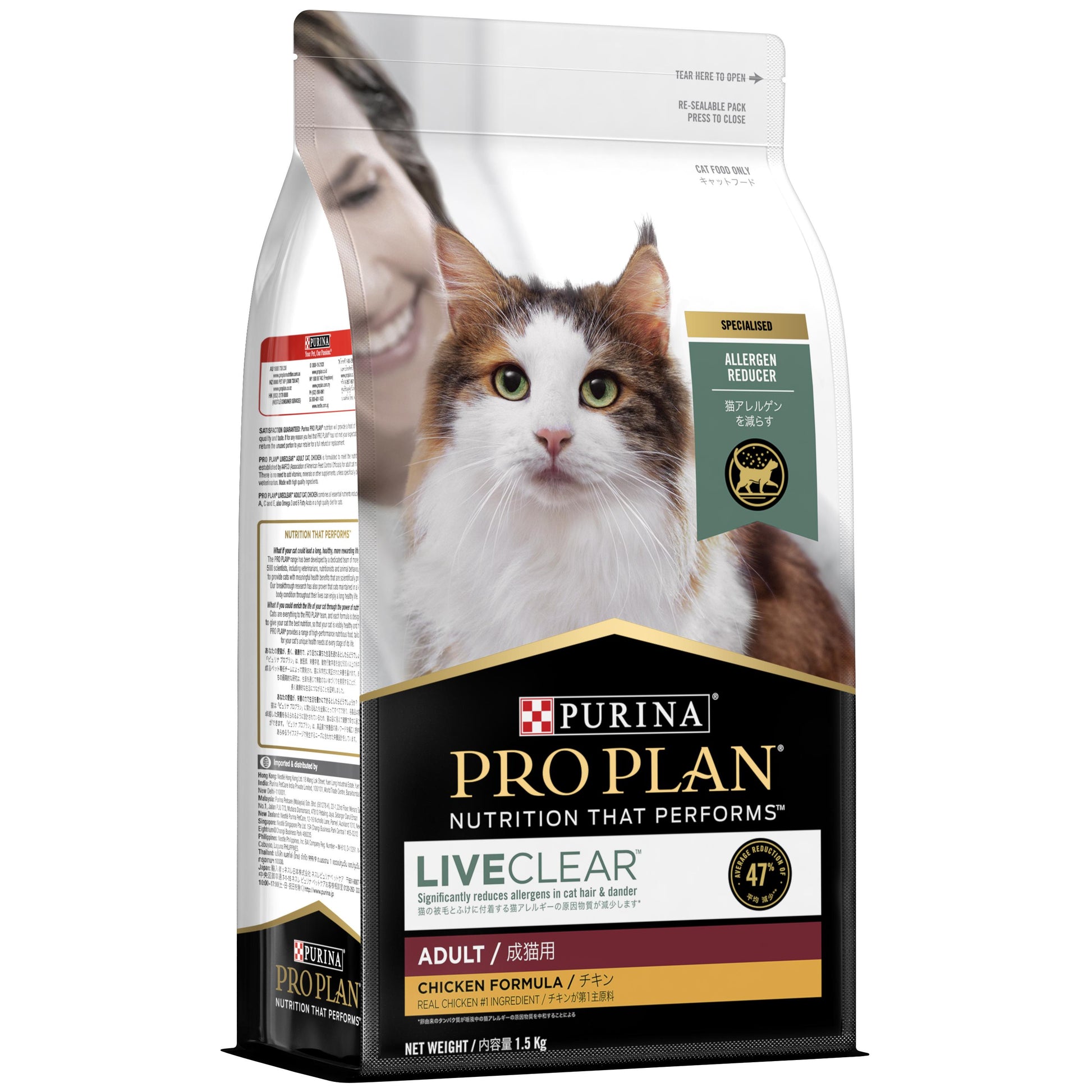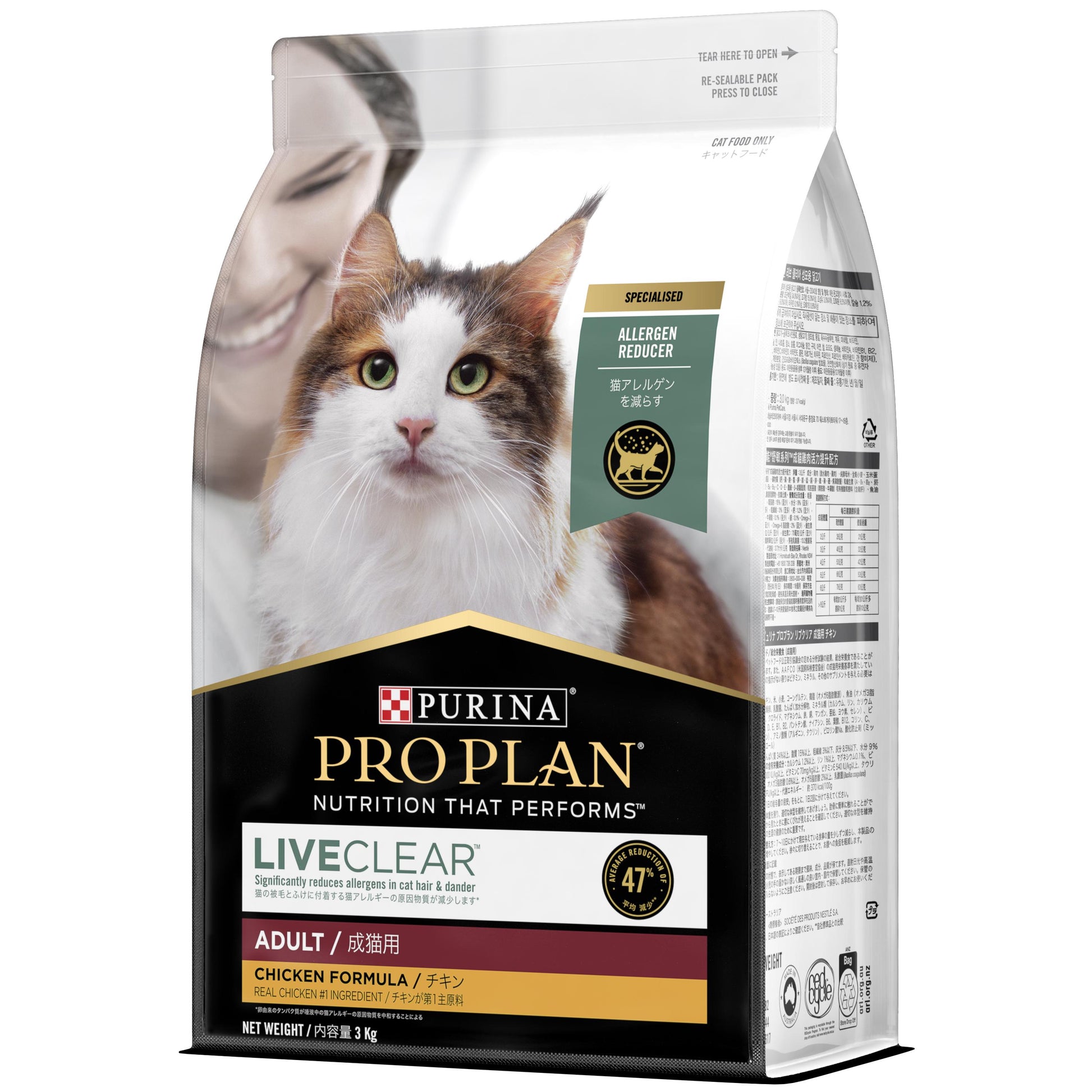 Pro Plan LIVECLEAR has been formulated to reduce allergens in cat hair and dander by an average of 47%, with the outstanding nutrition and real chicken as the #1 ingredient your cat will love this food.