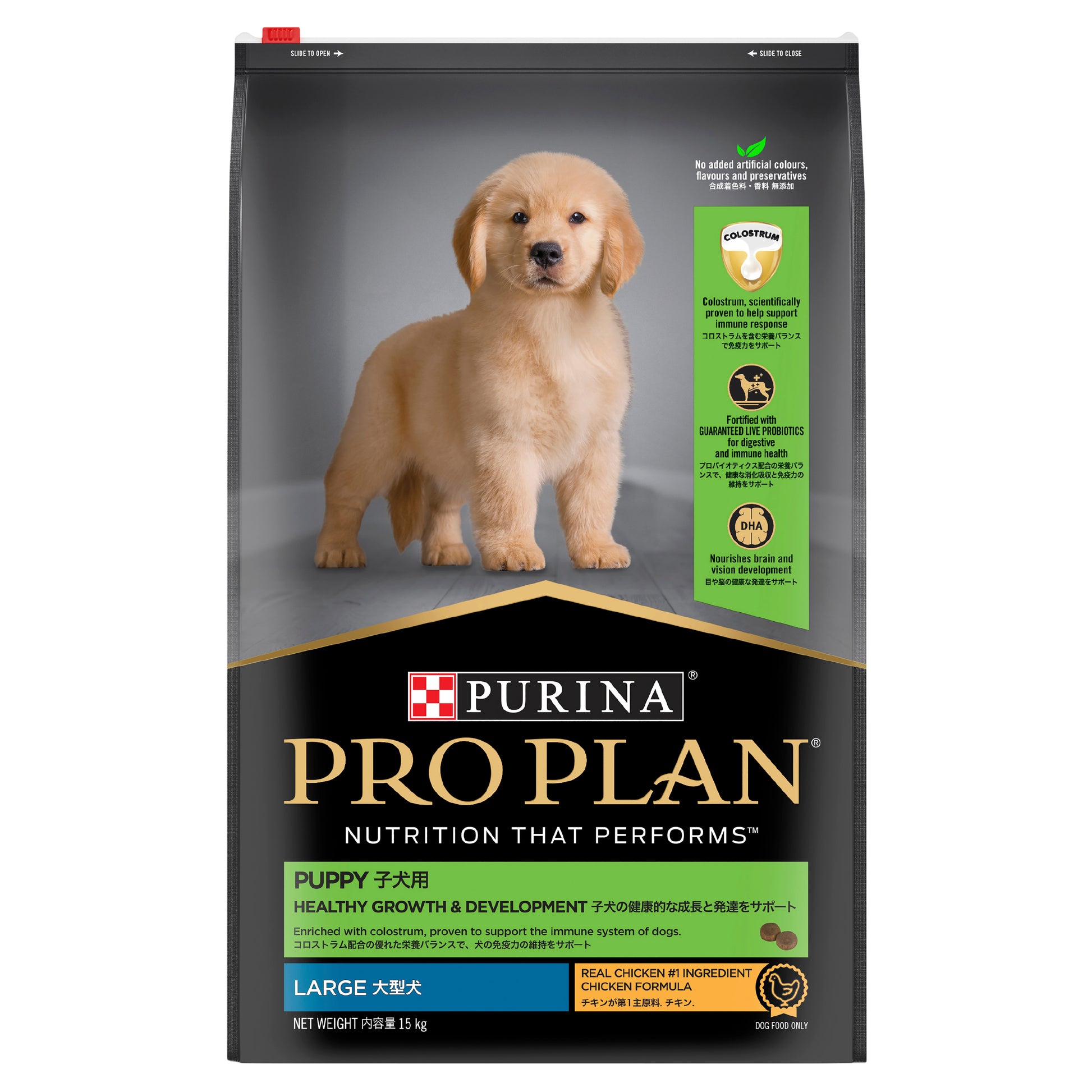 The first year of your dog's life is crucial to their long-term health, which is why they need nutrition specificially formulated to nourish their developing bodies and minds. PRO PLAN Puppy Large Breed Chicken Dry Dog Food with Colostrum and Probiotics combines all the essential nutrients that puppies need, including colostrum - proven to boost the immune system and protect them from common intestinal upsets. These recipes help provide targeted benefits, such as high digestibility and high nutrient absorption to support your dog’s long-term health. The natural glucosamine and minerals help support healthy joint, skeletal and teeth development for large breed puppies. Now with PRO PLAN, you can nourish your dog's microbiome with Probiotics to support their gut, immune and overall health.