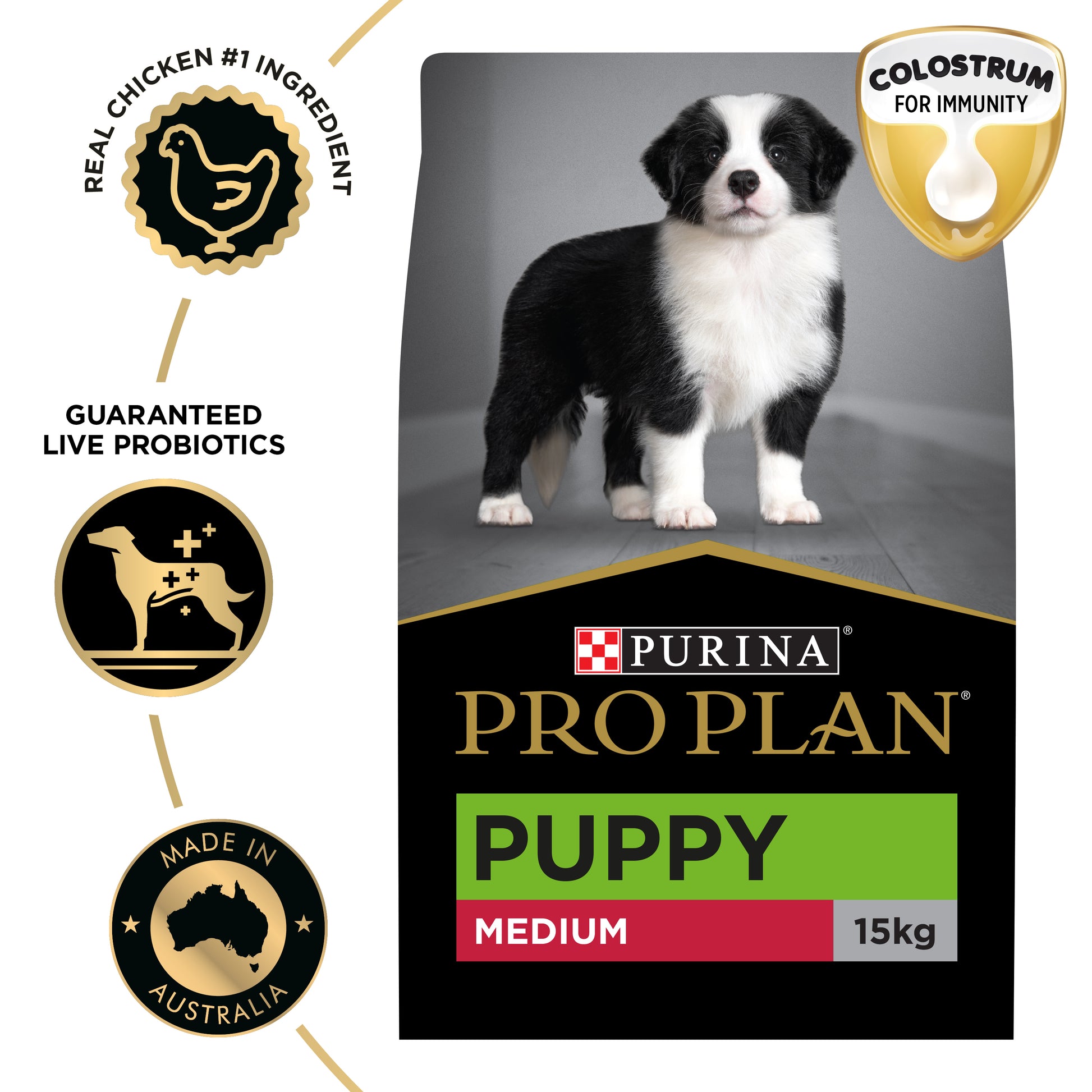 The first year of your dog's life is crucial to their long-term health, which is why they need nutrition specificially formulated to nourish their developing bodies and minds. PRO PLAN Puppy Medium Breed Chicken Dry Dog Food with Colostrum and Probiotics combines all the essential nutrients that puppies need, including colostrum - proven to boost the immune system and protect them from common intestinal upsets. These recipes help provide targeted benefits, such as high digestibility and high nutrient absorption to support your dog's long-term health. Now with PRO PLAN, you can nourish your dog’s microbiome with Probiotics to support their gut, immune and overall health.