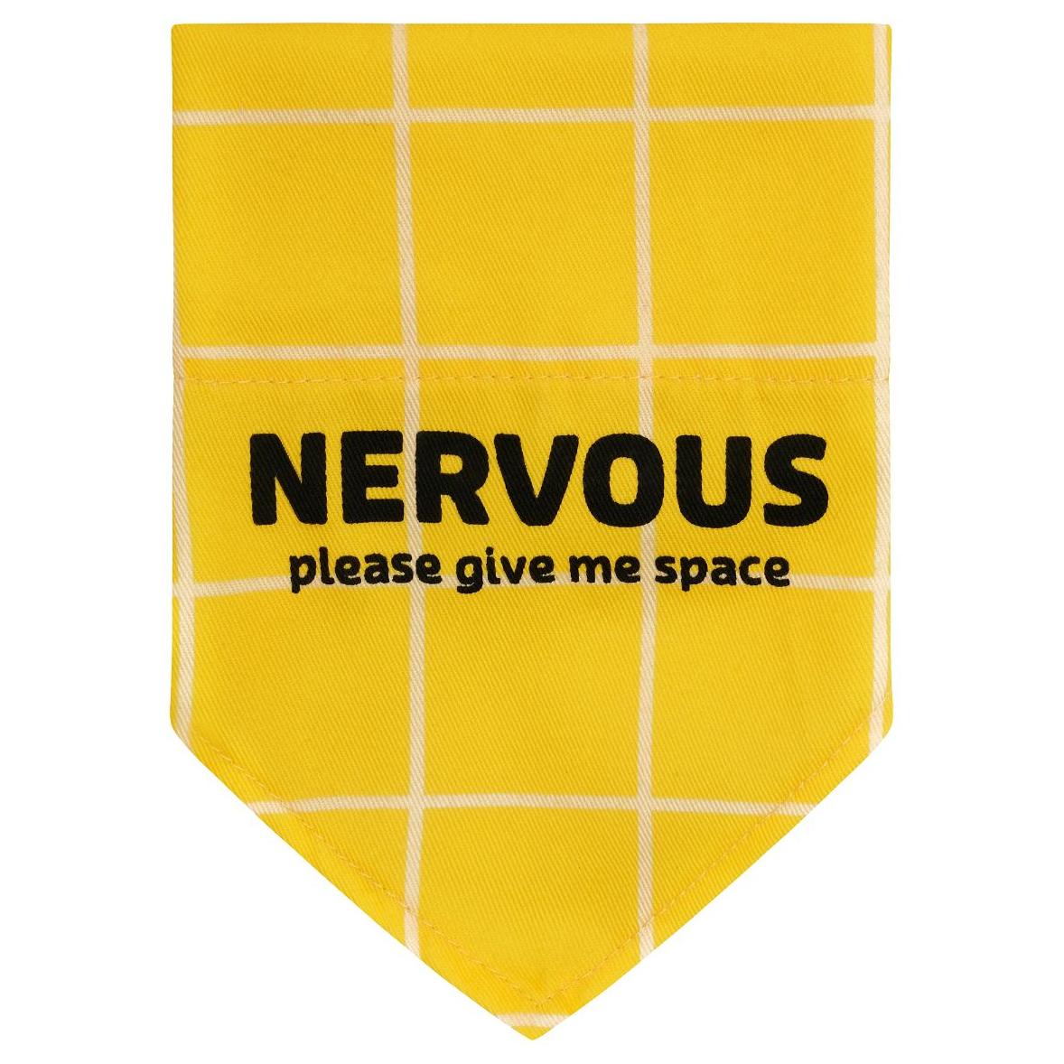 Get the space your nervous or reactive dog needs to feel comfortable. Slide your dog's collar through the bandana and more at ease when out in public. The bandana is bright yellow, a well known colour to proceed with caution and states 'NERVOUS please give me space'.