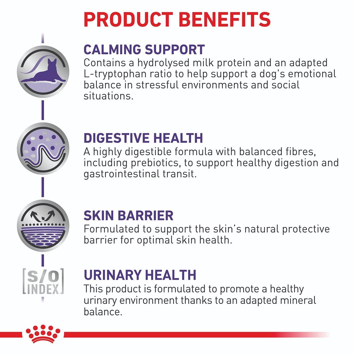 ROYAL CANIN CALM SMALL DOG is a veterinary exclusive dry dog food specially crafted to help maintain your adult dog’s emotional balance. Suitable for dogs up to 15kg in weight, this diet includes calming nutrients (L-tryptophan and hydrolysed milk protein) as well as calming support for stress-related digestive upsets, skin irritations, and urinary sensitivities. Prebiotics and a highly digestible formula support digestive health. Precise amounts of B vitamins and amino acids reinforce the skin barrier and help sensitive skin. Plus, the exclusive S/O index aids urinary health by creating an environment unfavourable to crystal formation in the bladder.