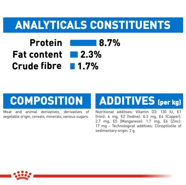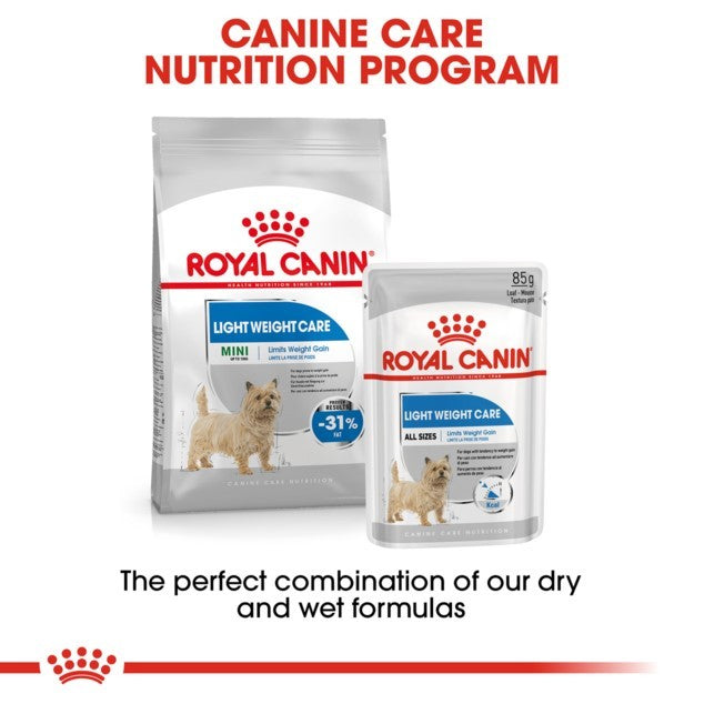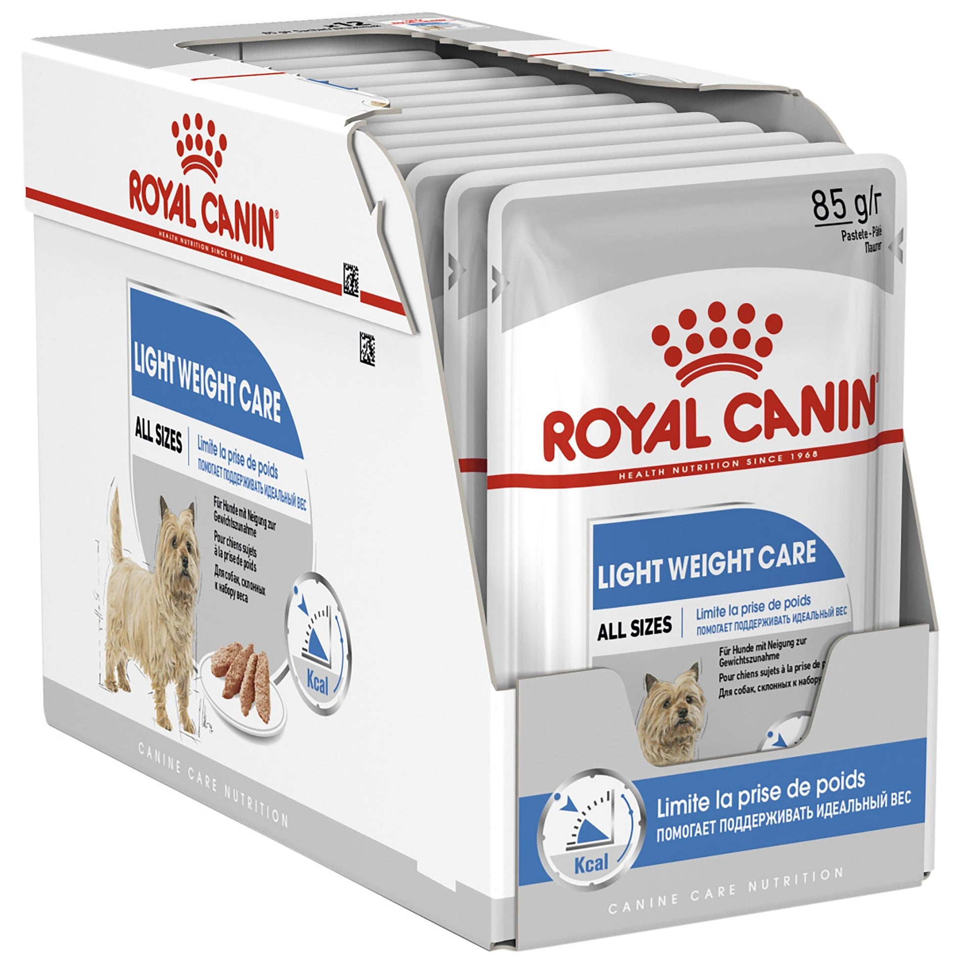 Overweight dogs often suffer from the strain that the extra pounds put on their joints.Lighten your dog’s load with high-quality nutrients specially designed to help maintain an ideal bodyweight. Royal Canin Light Weight Care Loaf is suitable for dogs of all sizes that are prone to weight gain. Rich in highly digestible proteins, this extra-tasty recipe helps to make sure your dog maintains a healthy muscle mass, it also has a reduced fat and calorie content.