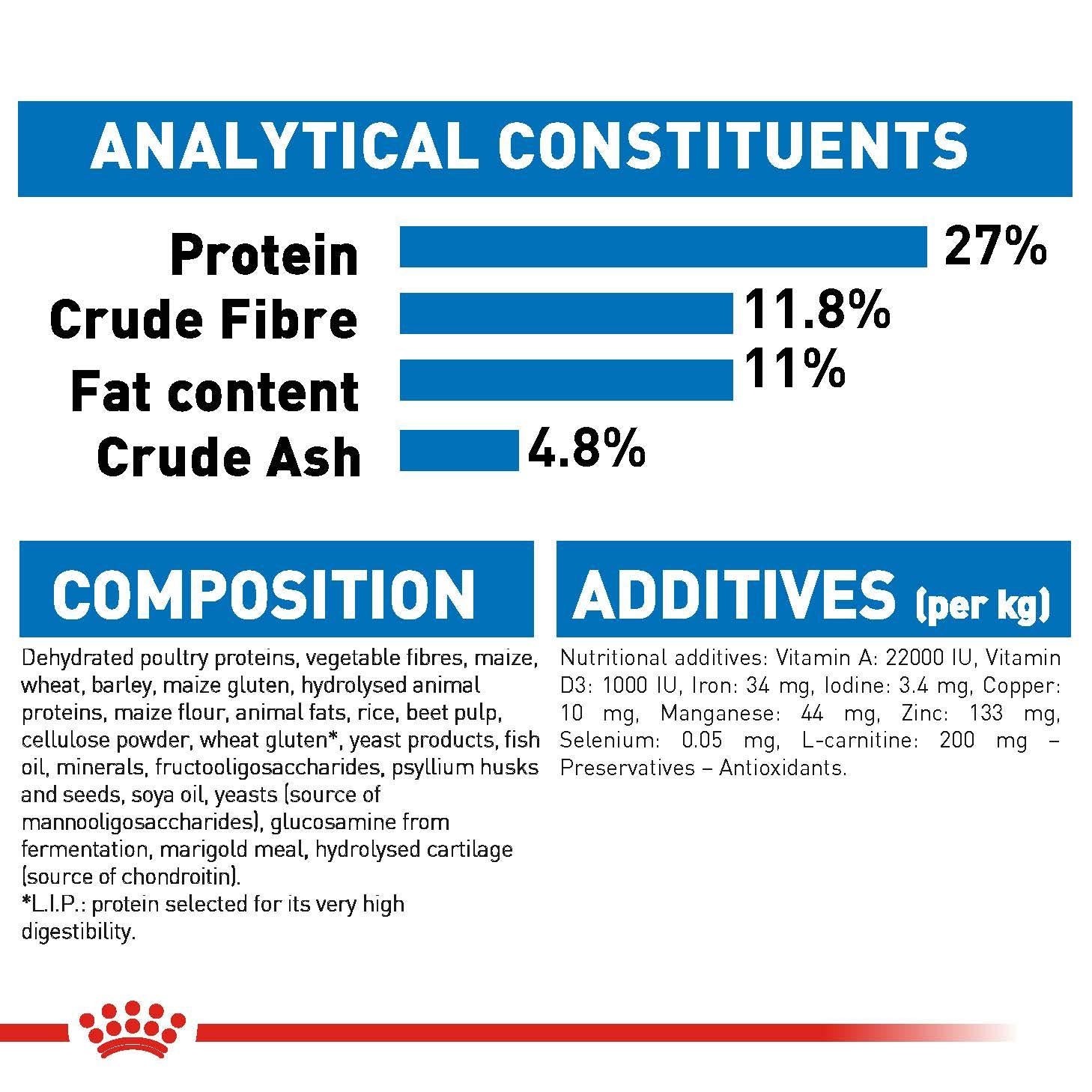 If your dog’s overweight, it can put a strain on their joints and general health. This formula is crafted to support your dog’s overall well being, but has radically less fat to help them stay trim, active and light on their paws. An optimal balance of fibres helps your dog feel full and also helps with better digestion. And this formula is rich in the highest quality proteins to ensure they maintain muscle mass. It also contains Omega- 3 fatty acids EPA and DHA to help support your dog’s joints.