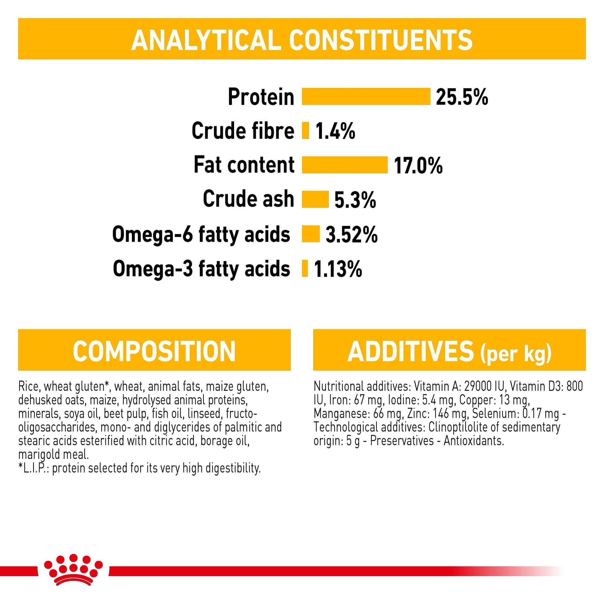 Please Note: Royal Canin® takes pride in ensuring the scientific reliability of all product information. The information in this product listing was true and accurate at the time of publication. However, please note that from time to time, for example due to ingredient availability or a change in sourcing factory within our global factory network for the purpose of ongoing supply, it is necessary to make product changes at short notice, and there may be some delays in updating the information in our product materials.