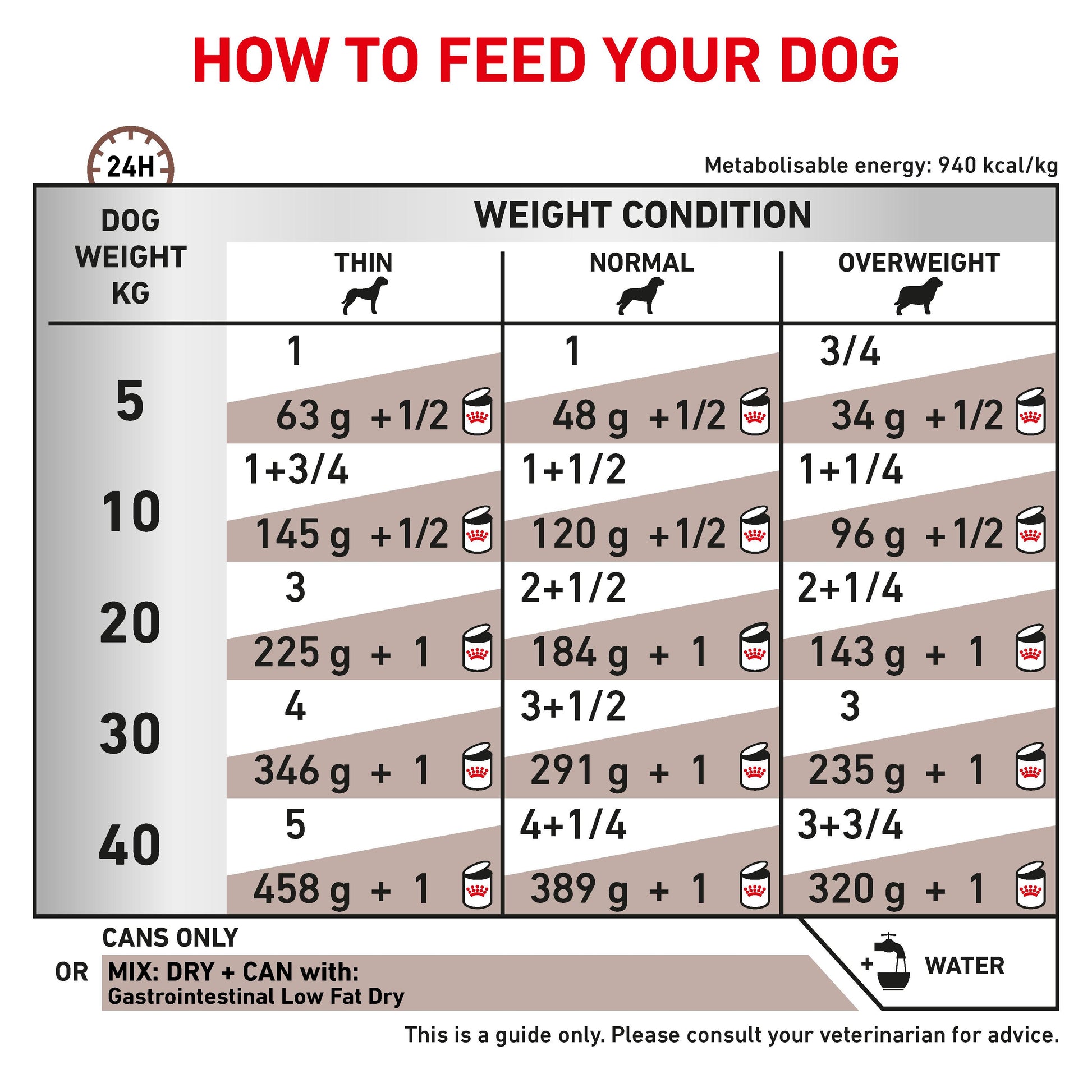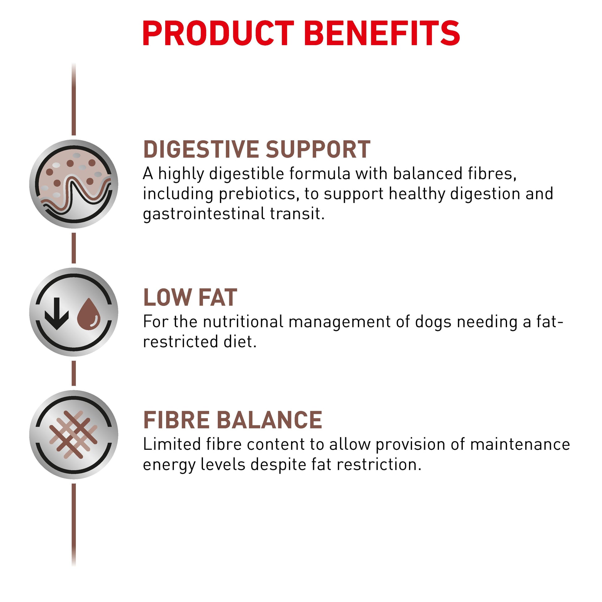 ROYAL CANIN GASTROINTESTINAL LOW FAT is a complete diet for adult dogs with gastrointestinal diseases that require fat restriction (e.g. acute and chronic pancreatitis) or support of lipid (fat) metabolism in the case of hyperlipidaemia. This highly digestible formula has a low fat level with a fibre balance intended to meet energy requirements (despite fat restriction), and the inclusion of prebiotics to support a healthy digestion and transit.