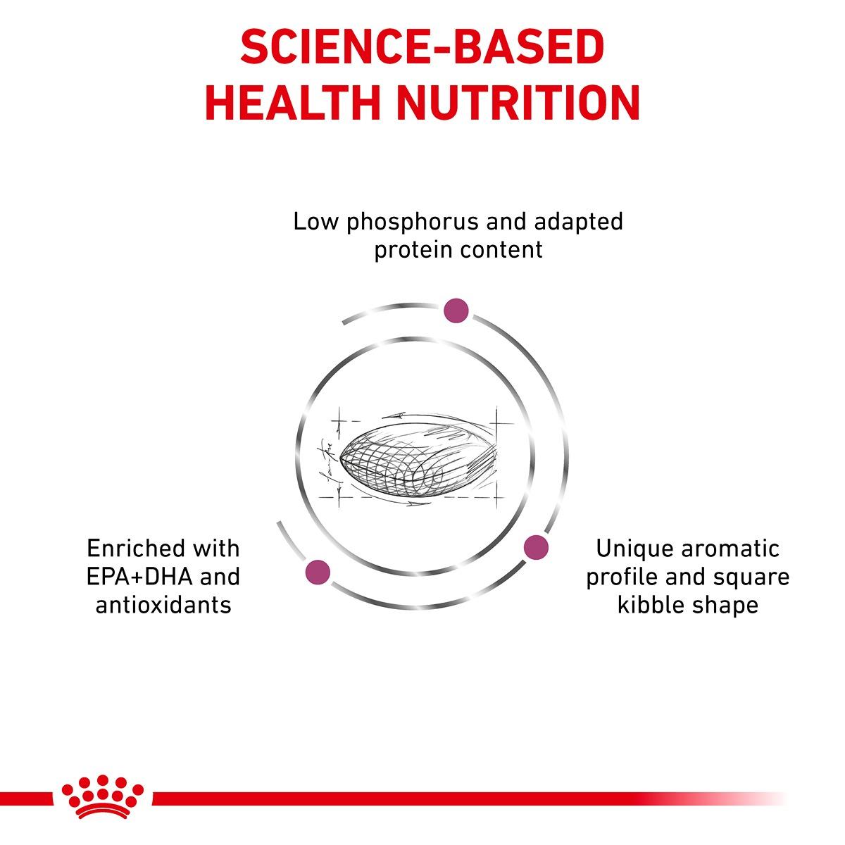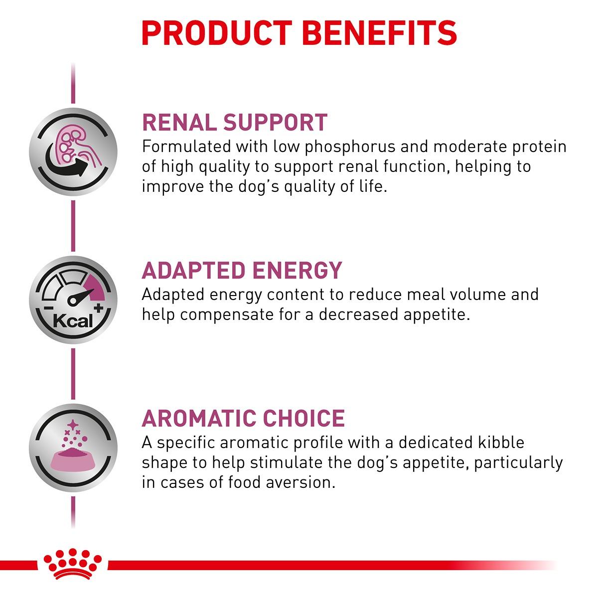 ROYAL CANIN Renal dry is a complete dietetic feed for dogs formulated to support renal function in the case of chronic renal insufficiency, through its restricted levels of phosphorus and high-quality proteins.