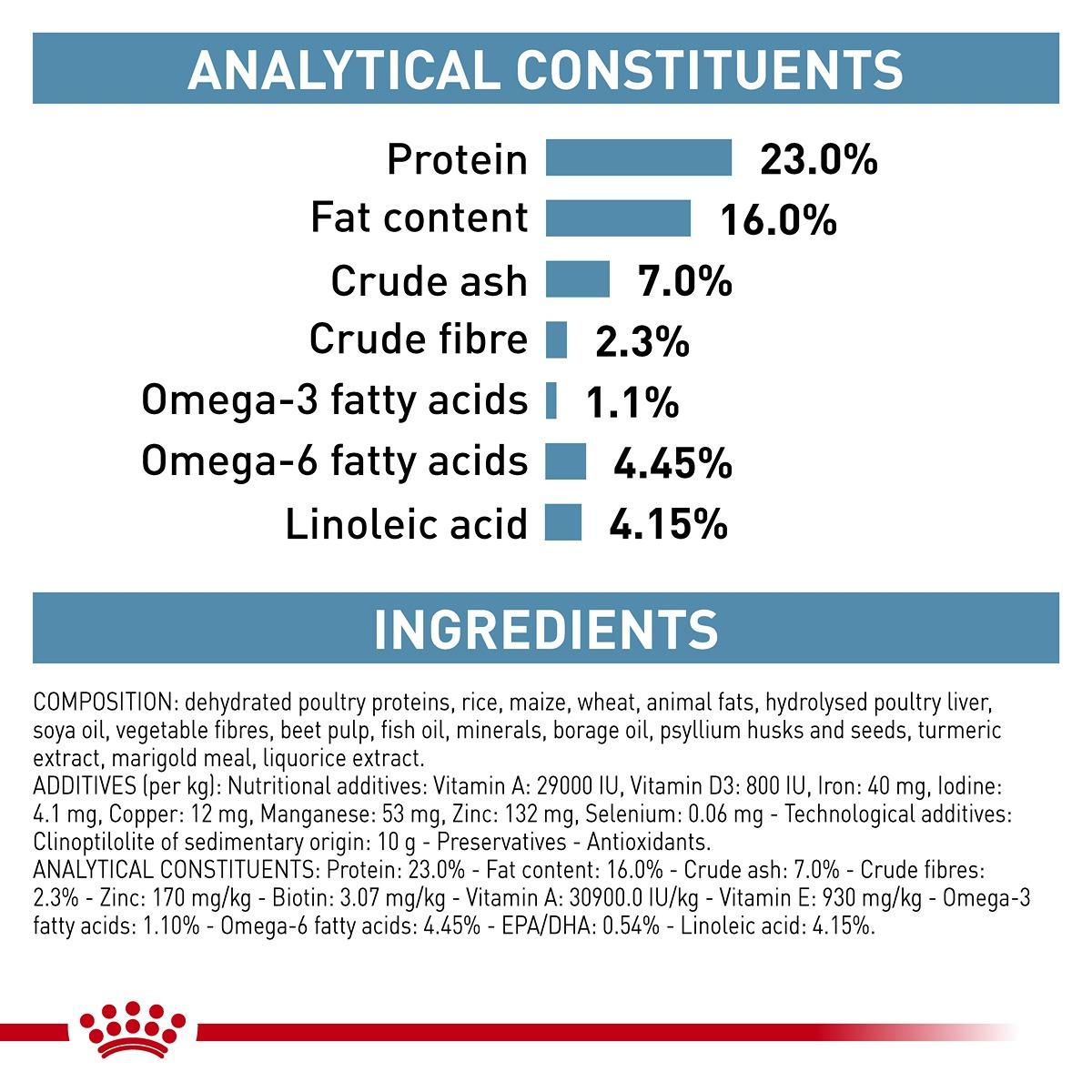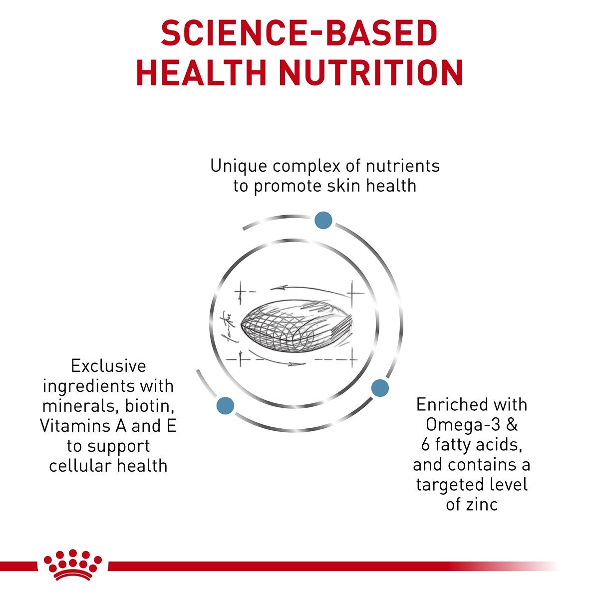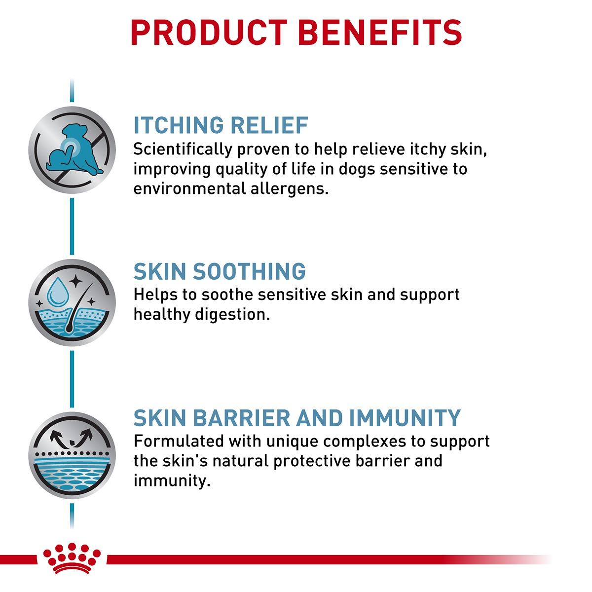 ROYAL CANIN SKINTOPIC is a complete diet for adult dogs over 10kg. The diet is formulated with a unique DERMAUXILIUM™ complex of active compounds (including EPA/DHA and linoleic acid), clinically proven to help support optimal skin quality and coat health in dogs with skin disease such as atopic dermatitis (skin lesions and inflammation of the ear canal).
