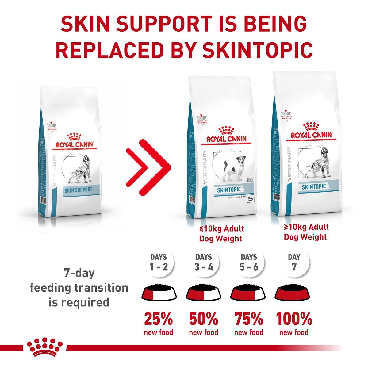 When transitioning your dog from Skin Support to Skintopic, a 7-day feeding transition is required. For dogs under 10kg, please feed Skintopic Small Dog. Dogs exactly 10kg can be fed either.